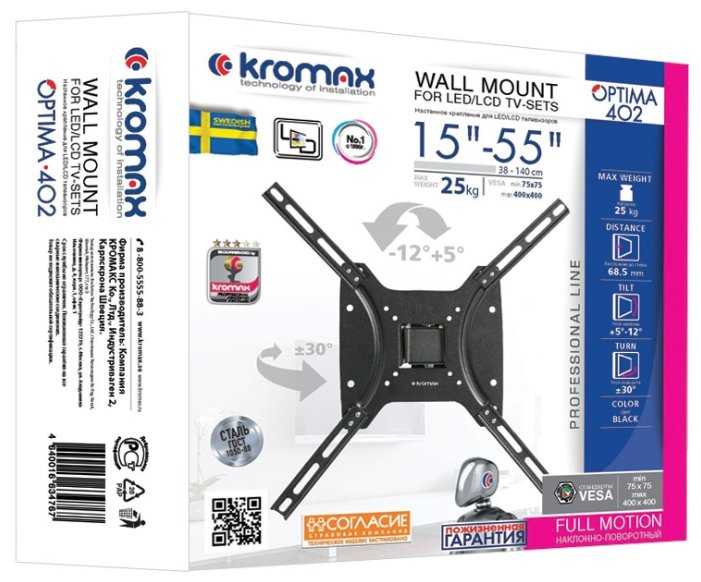Этот кронштейн Kromax Optima-402 Black с ограниченной подвижностью, он имеет небольшой градус поворота и наклона. Меня устроило качество этой модели и его технические параметры подошли к телевизору, который требовалось закрепить на стене. Рассчитан он на чуть большие нагрузки, чем телевизор и меня устроило то, что оставался небольшой запас прочности, так сказать. Собирается он просто, установка тоже несложная, все необходимое поставляется в комплекте с кронштейном. Цена модели не сказать, что прям бюджетная, есть в продаже модели и подешевле, с такими же техническими характеристиками, а вот металл у этой модели получше оказался, при наглядном сравнении, он даже и потяжелее по весу. Вообщем кронштейн хороший, точно ничего не погнётся и не отломится- рекомендую!