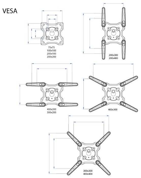| Стандарт крепления VESA : | 100x100 мм, 100x200 мм, 200x100 мм, 200x200 мм, 200x300 мм, 200x400 мм, 300x200 мм, 300x300 мм, 400x200 мм, 400x300 мм, 400x400 мм, 75x75 мм |