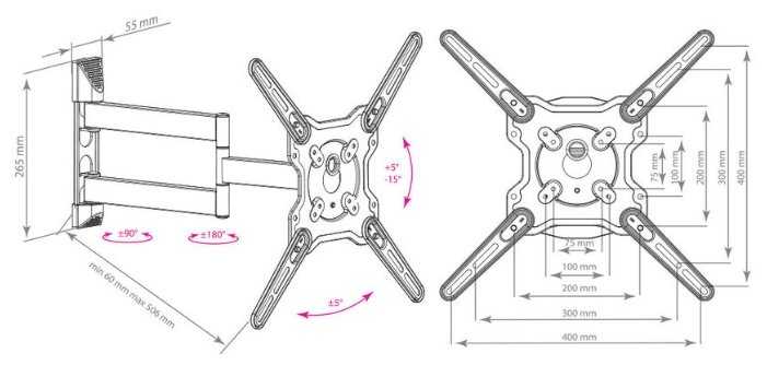 - - отступ от стены несколько отличается от заявленного при эксплуатации, предполагающей разворот панели тв на 90 градусов от поверхности установки кронштейна