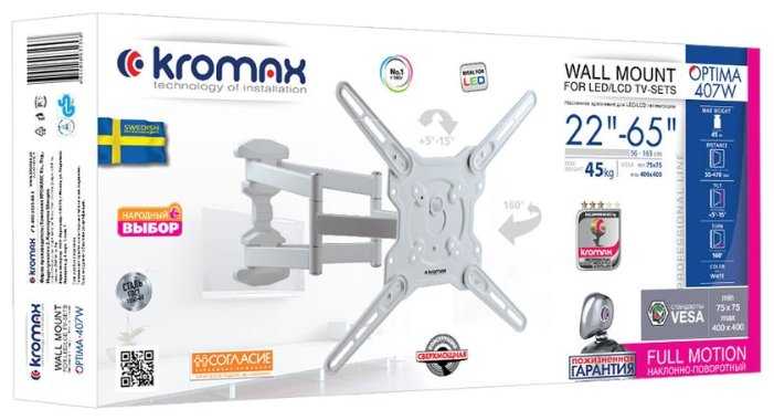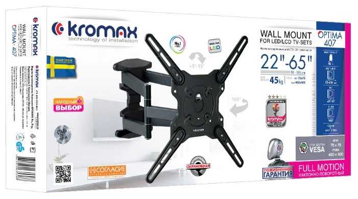 Второй кронштейн от Kromax в пользовании. Надёжность, толщина металла, держит 65 дюймов без усилий, 2 шарнира, хороший комплект поставки, всё есть. легко держит больше 50 кг.