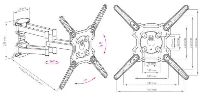 - Большой угол поворота (до 45 градусов), наклон по горизонтали и вертикали, выдвигание до 70 см от стены.