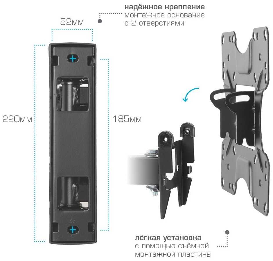 | Дополнительная информация : | Комплектация - Кронштейн для телевизора, комплект крепежа для установки ТВ, подробная инструкция на русском языке |