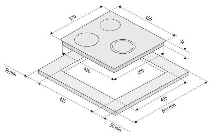 - Ширина 45 см с тремя конфорками идеальна для хрущёвок (6 кв.м), не занимает много места.
