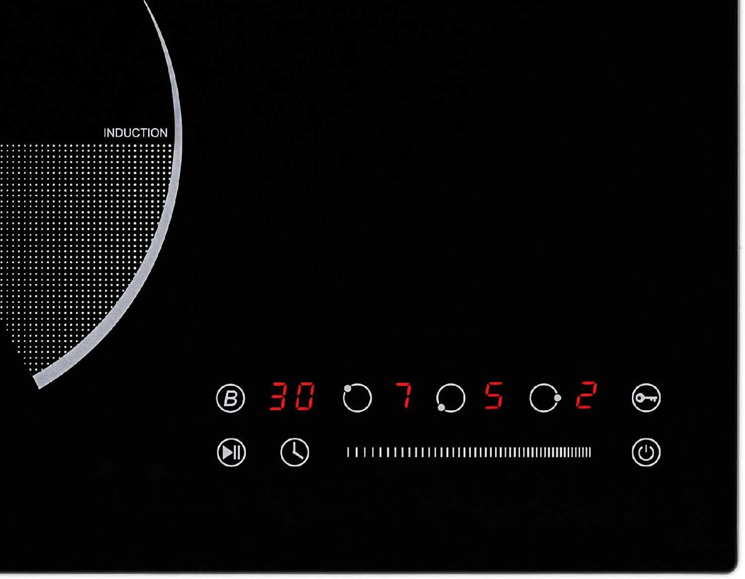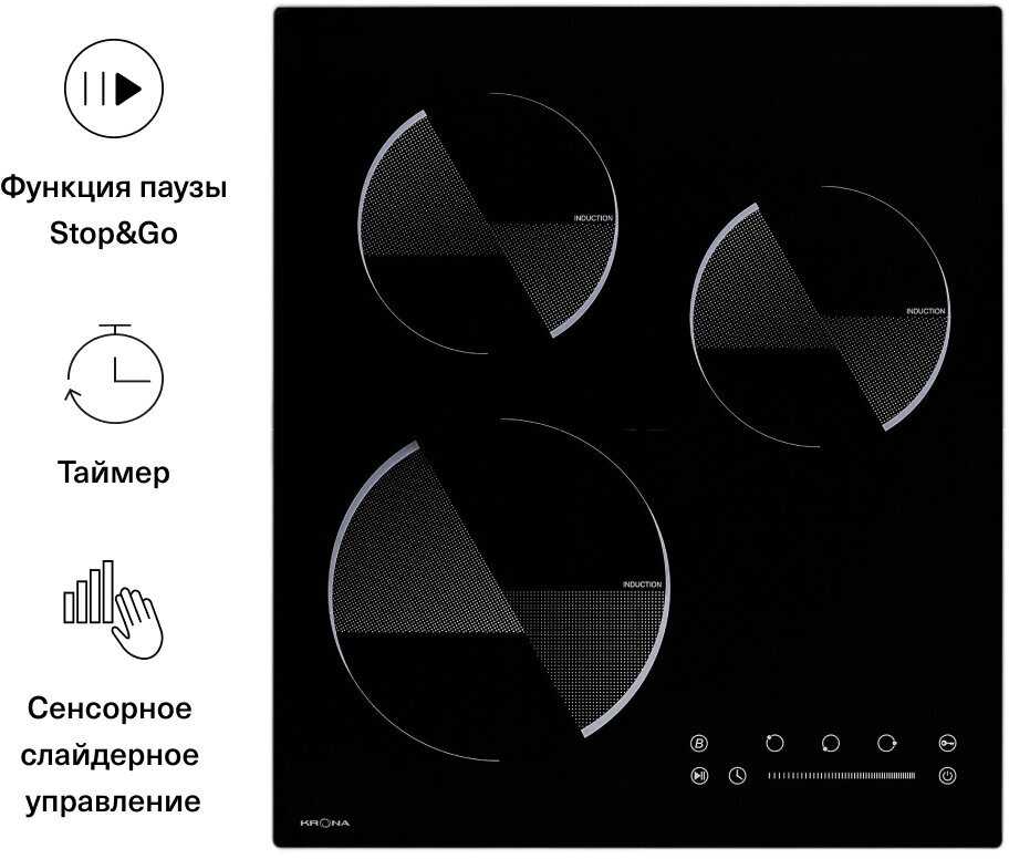- Функция паузы мгновенно приостанавливает все конфорки одним касанием.