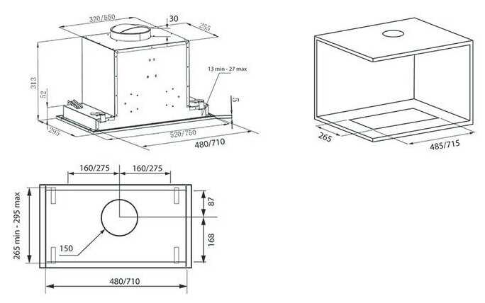 - + Эффективно очищает воздух от посторонних неприятных запахов и дыма во время приготовления пищи. Устройство можно встроить в кухонный гарнитур или зафиксировать на потолке. Вытяжка имеет два режима работы.