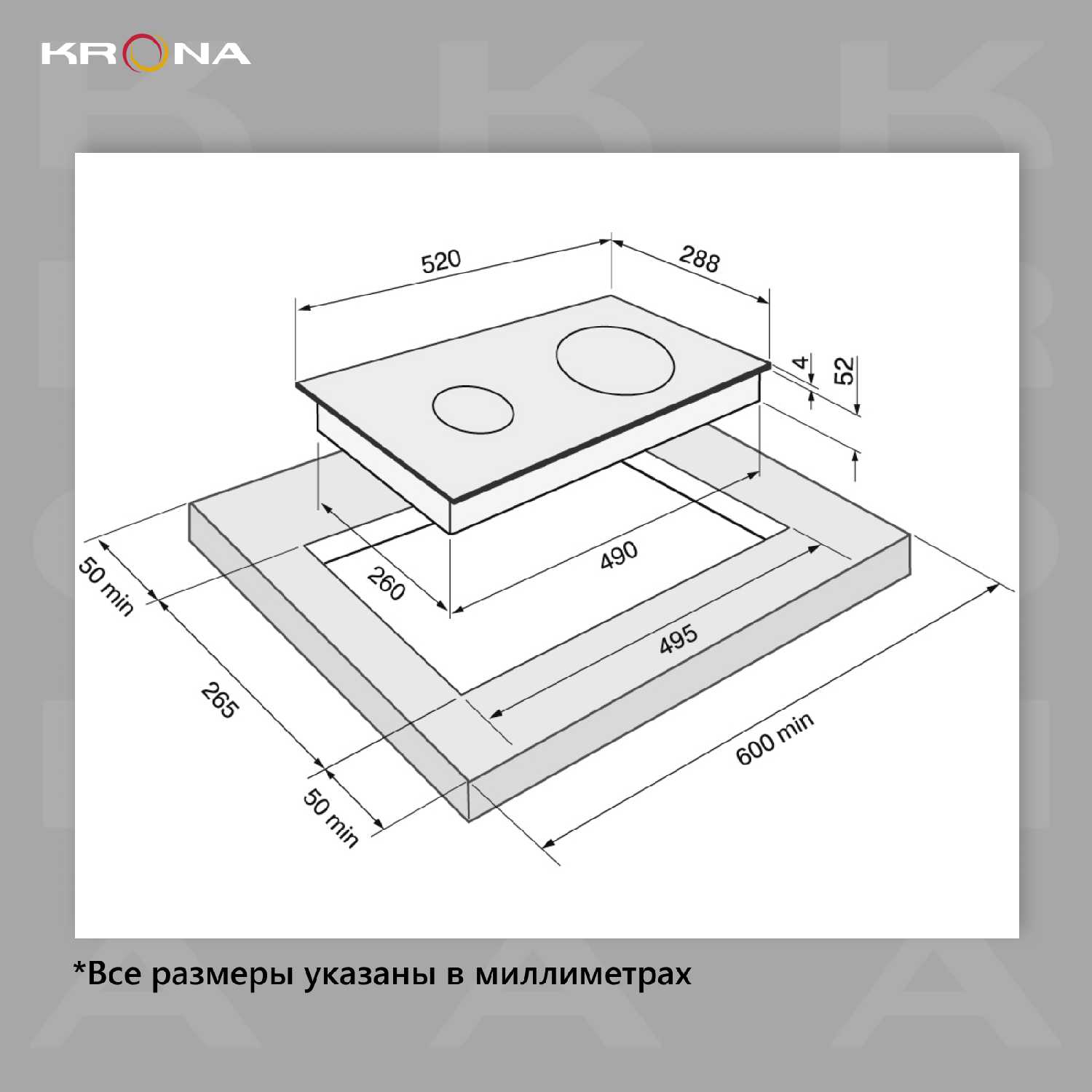 В комплекте предусмотрена уплотнительная лента и крепежи, а инструкция содержит детальные схемы выреза в столешнице. Кабель питания длиной ~1 м не имеет вилки — требуется прямое подключение к проводке или установка отдельной вилки. Важно соблюдать зазоры по периметру для вентиляции, указанные в руководстве. -