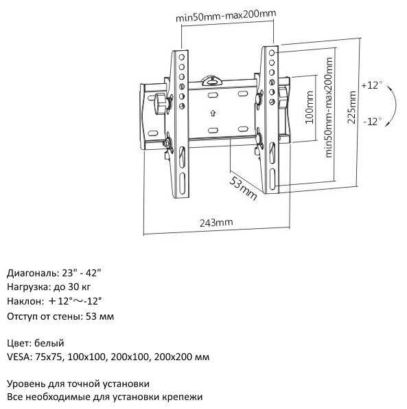 Характеристики:- кронштейн на стену назначение: ЖК-телевизор Максимальная нагрузка 30 кг диагональ ТВ 23-42 дюйм наклон