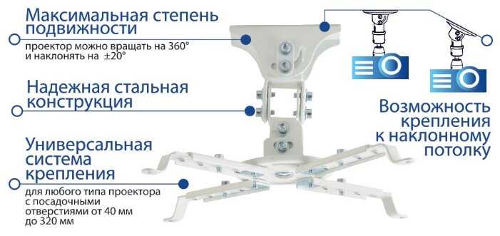 Характеристики:- кронштейн на потолок назначение: проектор Максимальная нагрузка 12 кг наклон поворот