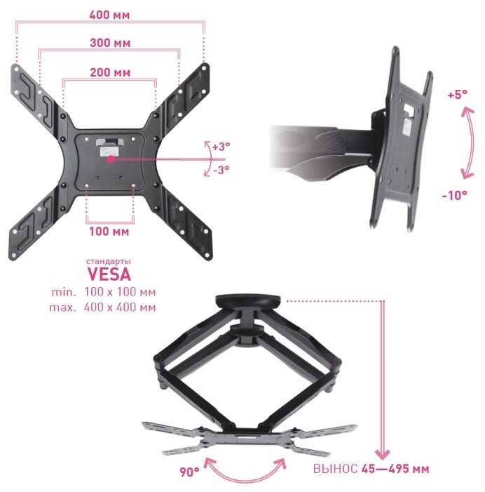 Характеристики:- кронштейн на стену назначение: ЖК-телевизор Максимальная нагрузка 55 кг диагональ ТВ 32-90 дюйм