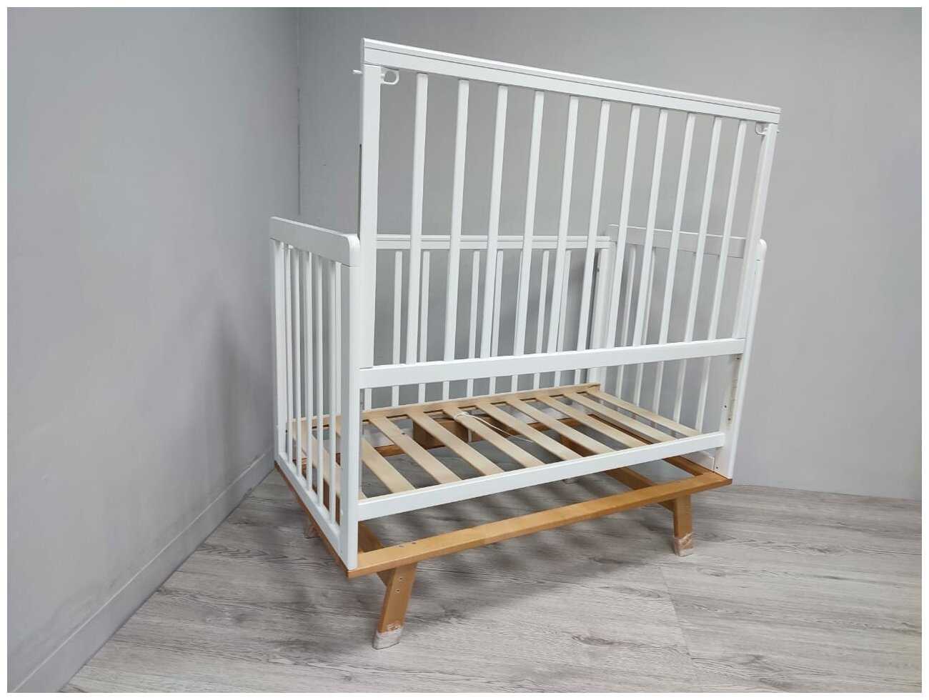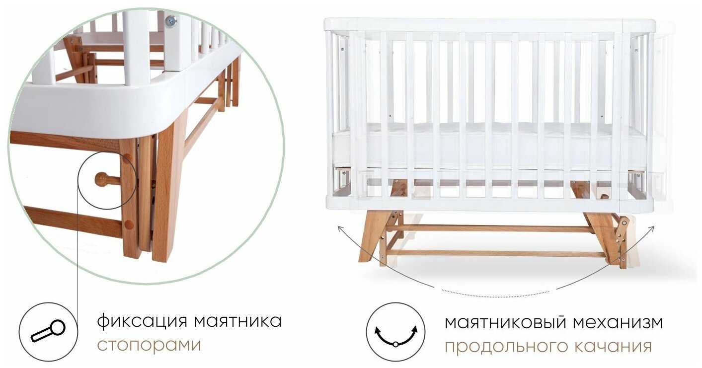 Характеристики:- классическая кроватка деревянный каркас полозья и маятник для качания размер матраса 60x120 см опускающаяся передняя стенка регулировка высоты дна защитные силиконовые накладки