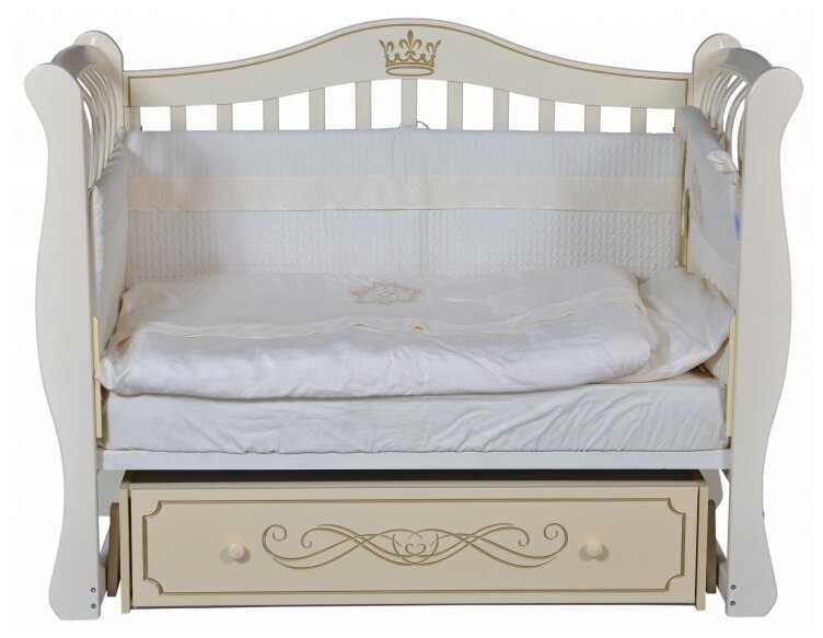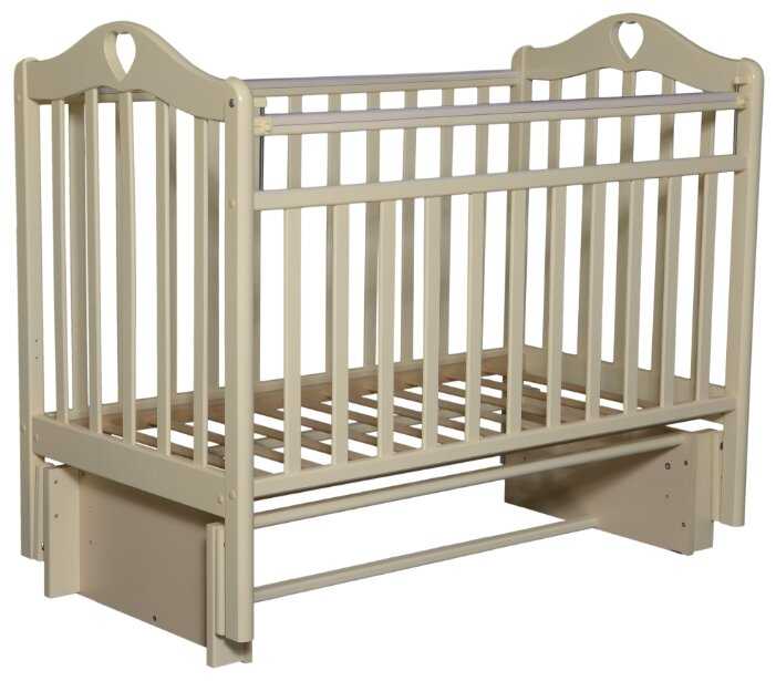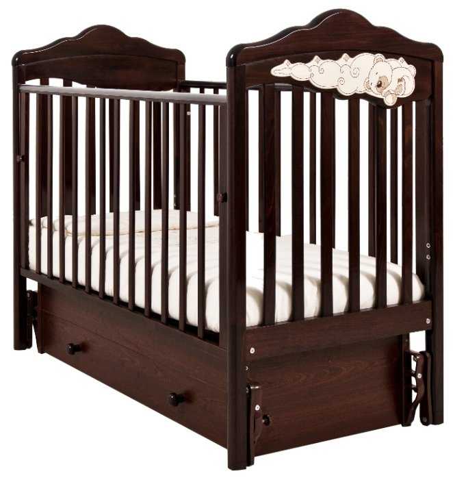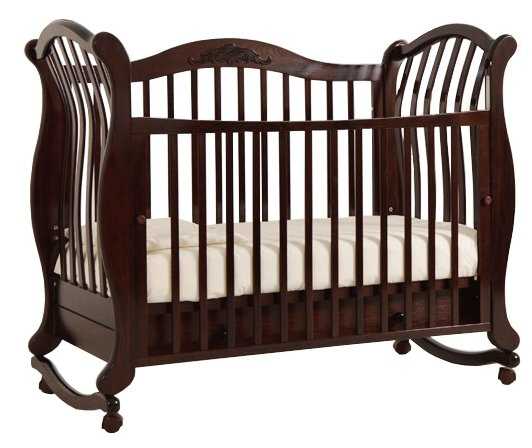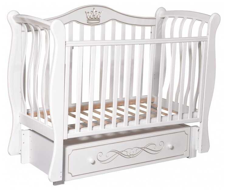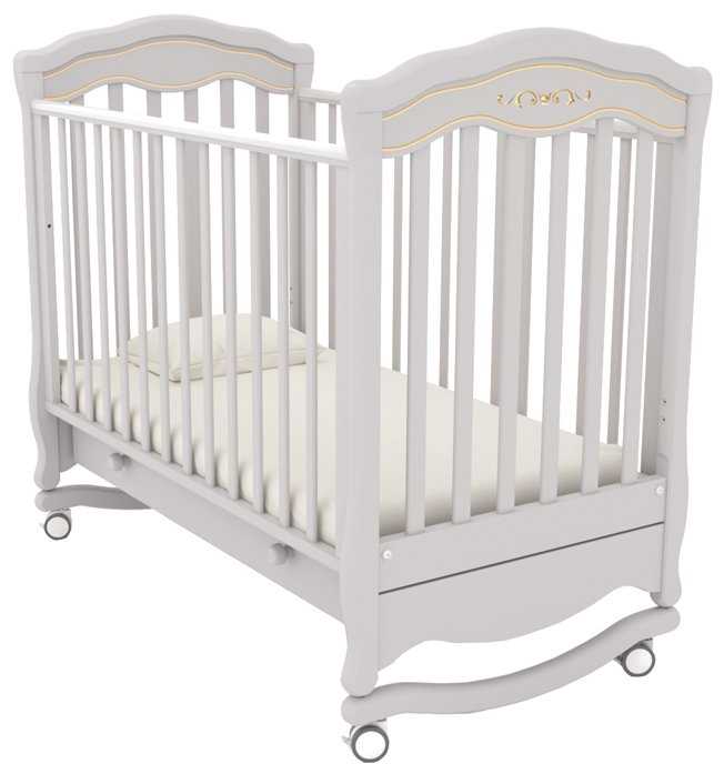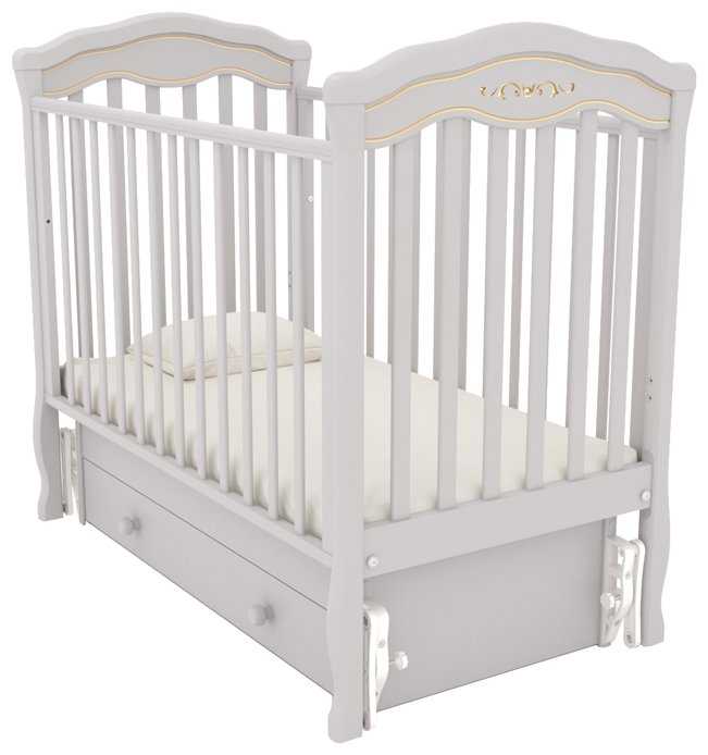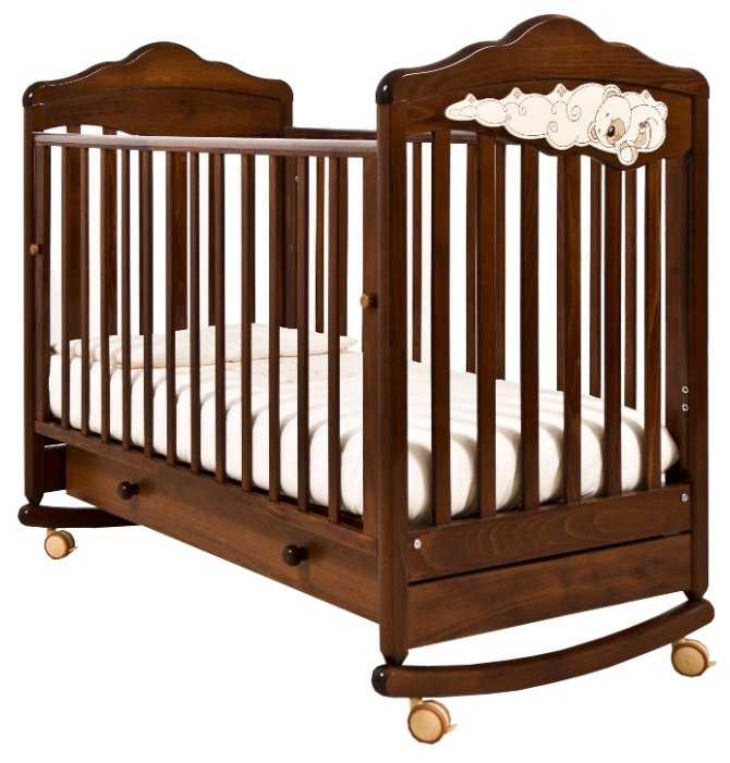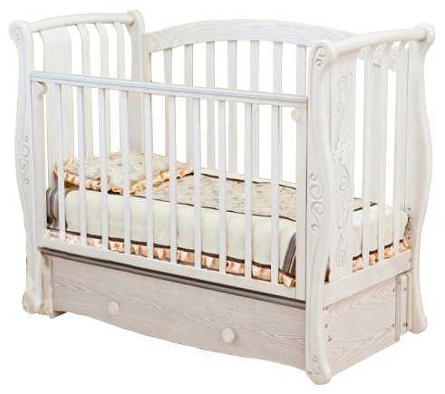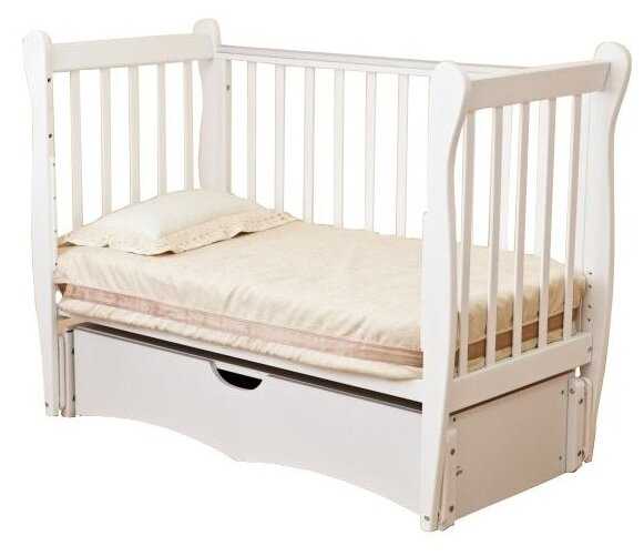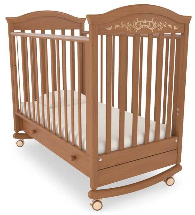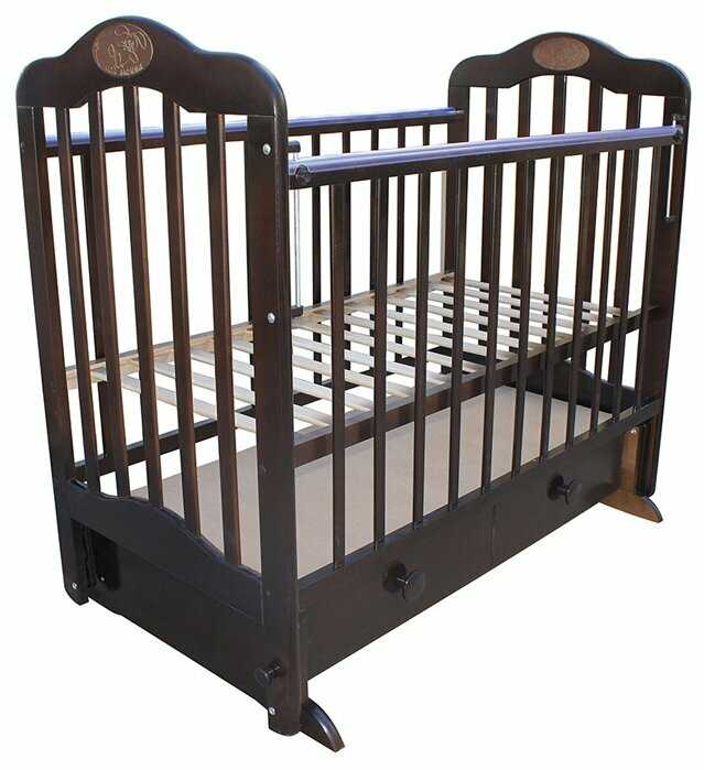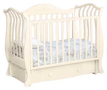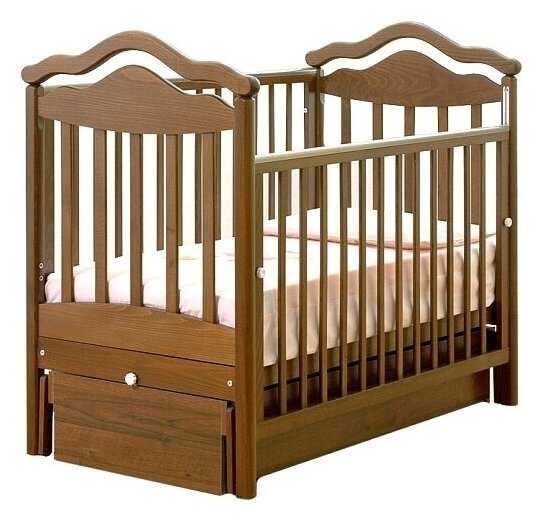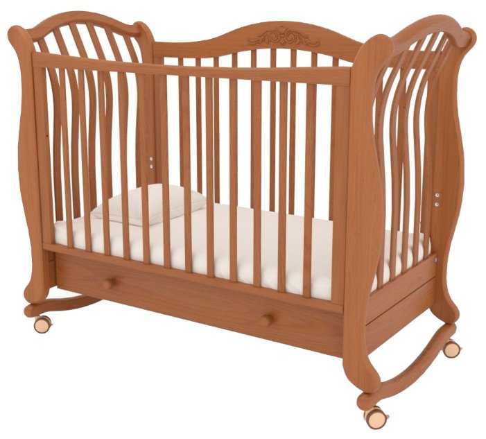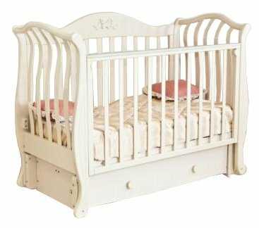 Характеристики:- классическая кроватка выдвижной ящик деревянный каркас маятниковый механизм качания опускающаяся передняя стенка