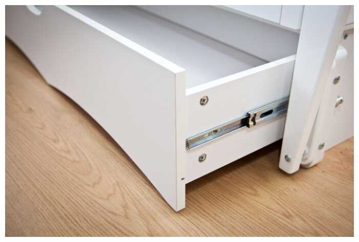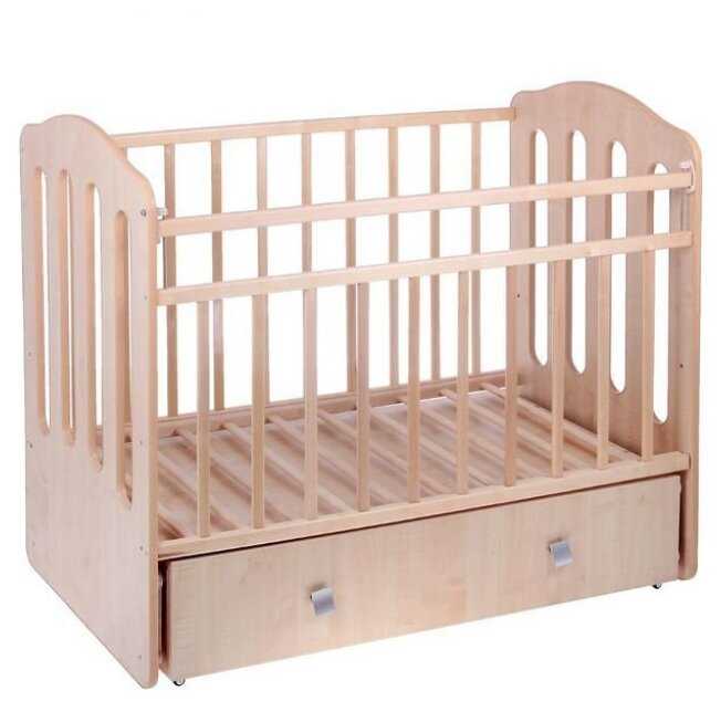 Характеристики:- классическая кроватка выдвижной ящик каркас из дерева и ДСП размеры 70x131x102 см размер матраса 65x125 см опускающаяся передняя стенка