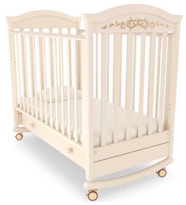 Характеристики:- классическая кроватка выдвижной ящик каркас из дерева и ДСП полозья для качания размер матраса 60x120 см опускающаяся передняя стенка