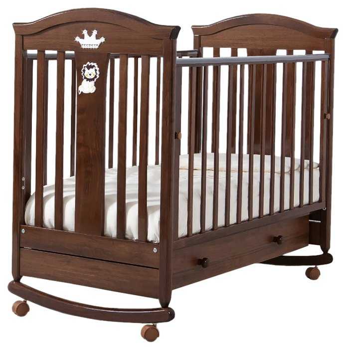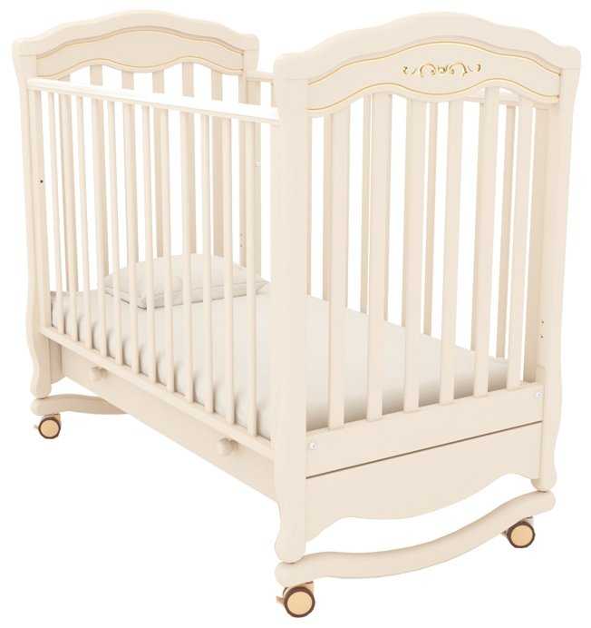 Характеристики:- классическая кроватка выдвижной ящик деревянный каркас полозья для качания размеры 72x127x111 см размер матраса 60x120 см опускающаяся передняя стенка регулировка высоты дна на колесах (со стопором) защитные силиконовые накладки