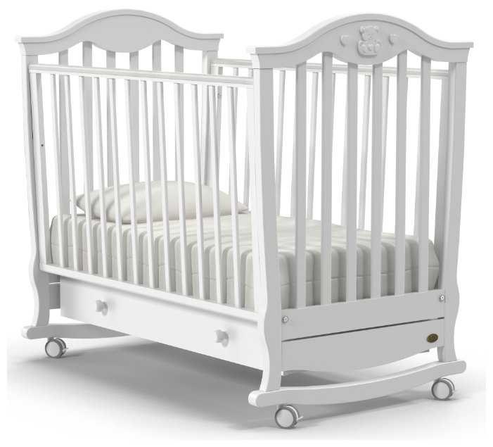 Характеристики:- классическая кроватка выдвижной ящик каркас из дерева и ДСП полозья для качания размеры 72x126x111 см размер матраса 60x120 см опускающаяся передняя стенка
