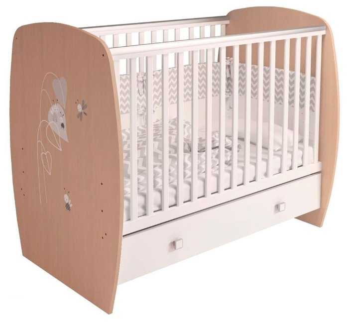 Характеристики:- классическая кроватка выдвижной ящик каркас из дерева и ДСП размеры 80x123x103 см размер матраса 60x120 см регулировка высоты дна защитные силиконовые накладки