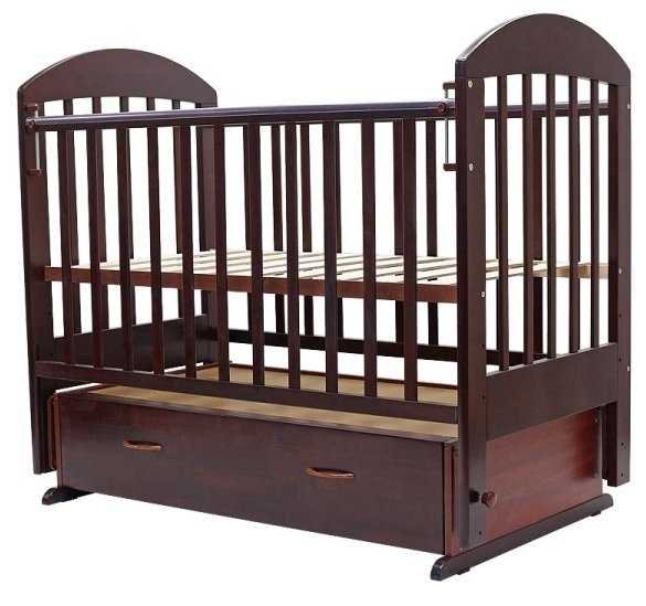 Характеристики:- классическая кроватка выдвижной ящик каркас из дерева и ДСП маятниковый механизм качания размер матраса 60x120 см опускающаяся передняя стенка