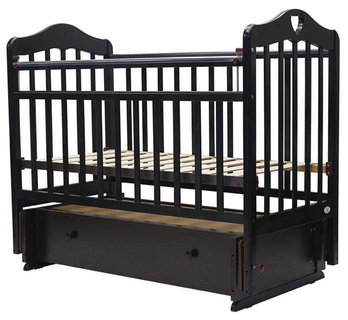 Характеристики:- классическая кроватка выдвижной ящик каркас из дерева и ДСП маятниковый механизм качания размер матраса 60x120 см опускающаяся передняя стенка
