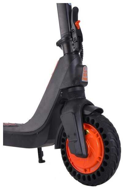 - + Помимо цены у него есть ряд других преимуществ. Первое отличие, которое сразу бросается в глаза, это большой цветной дисплей, который отображает такие показатели как: скорость, пробег, уровень заряда, подсветку, индикатор тормоза. Также электросамокат довели до совершенства и убрали все недочеты, которые были известны у электросамоката. Отсутствуют люфты у ручек, а более широкое заднее крыло ещё лучше защищает в дождливую погоду от летящих брызг. Самокат управляется с помощью двух рычагов, расположенных на рулевой стойке по обе стороны от рукояток. С правой стороны находится рычаг скорости. С левой стороны рычаг тормоза. При желании можно задействовать задний фрикционный (ножной) тормоз. Электросамокат оснащен 8 дюймовыми колёсами. В заднем колесе находится электродвигатель, который также выполняет роль электрического тормоза. Электросамокат легкий в управлении, весит 12, но благодаря высокопрочному алюминию конструкция выдерживает до 100, это серьезный транспорт не только для подростков, но и для взрослых людей