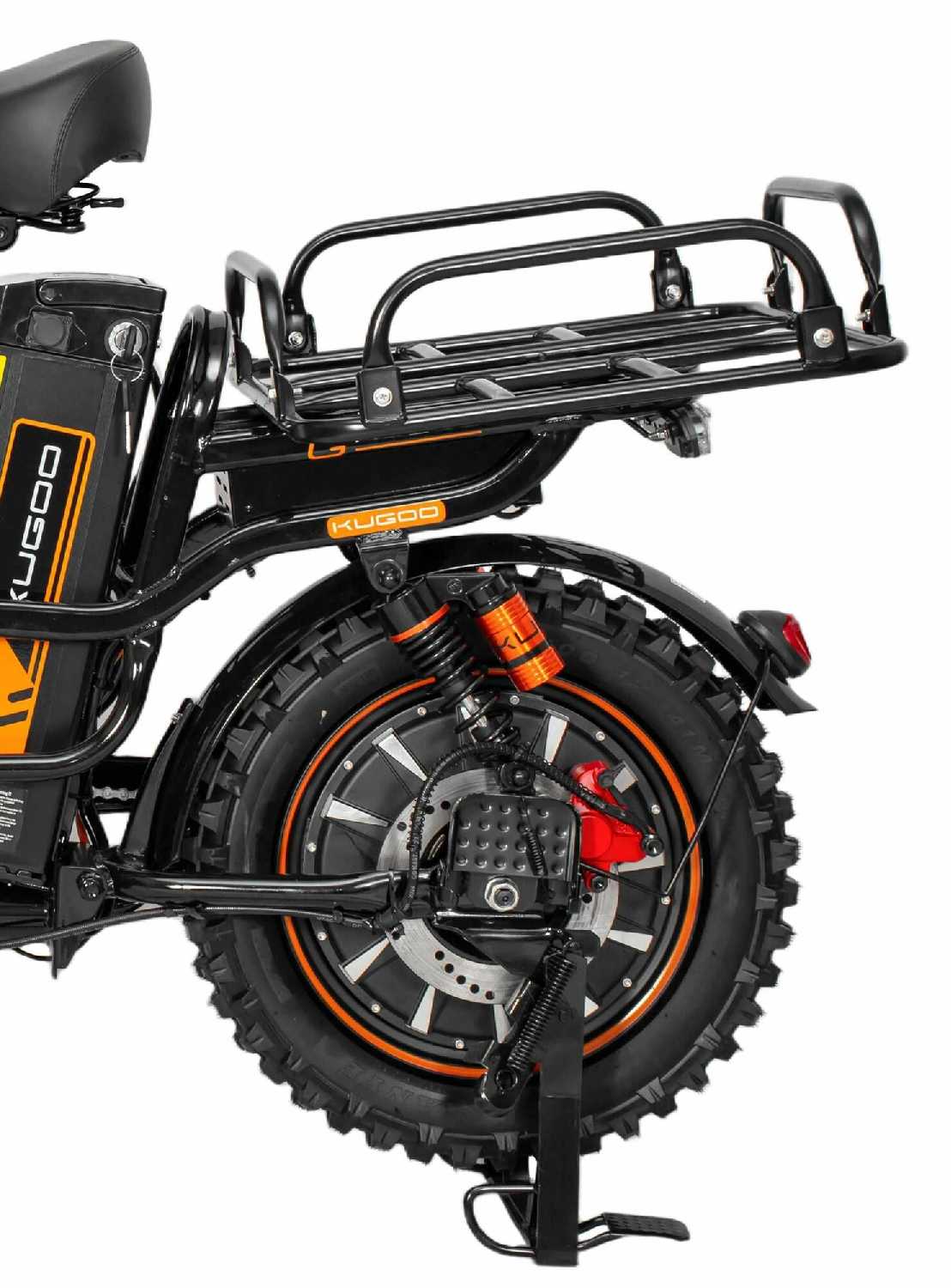 Велосипед уверенно везёт двух взрослых (общий вес до 140 кг) на ровной дороге благодаря усиленной раме и крутящему моменту мотора. Багажники спереди и сзади выдерживают курьерские грузы, но крепления заднего крыла могут иметь заводской брак (сорванная резьба). Для регулярных перевозок критично проверить затяжку всех болтов. -