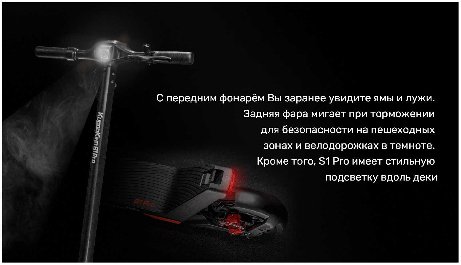 Особенности электросамоката : | задний габарит/стоп-сигнал, передняя фара (фонарь), подсветка |