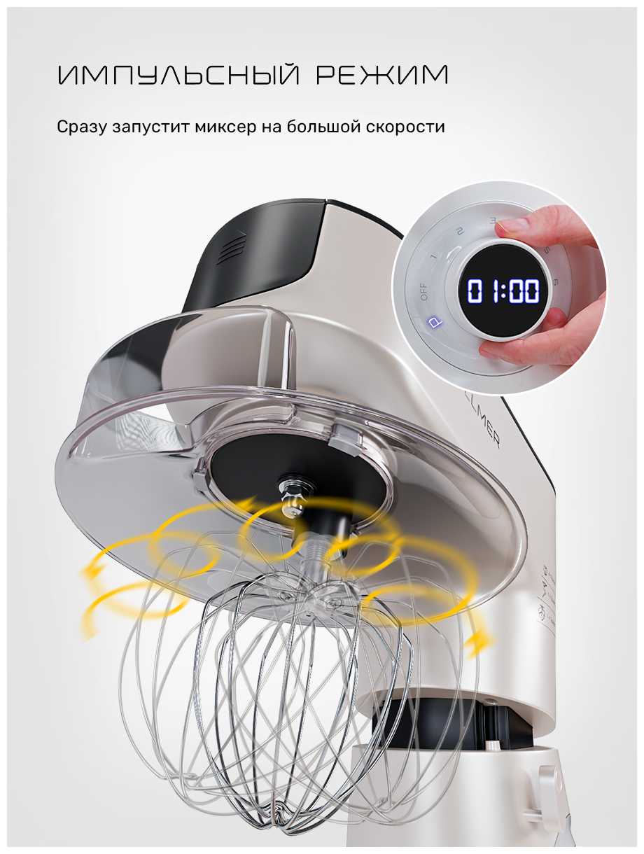 - Мощный, имеет три насадки для взбивания и перемешивания венчик, мешалка и крюк. И дополнительно имеет насадку для мясорубки. Я чесно думаю она лишняя, так как делать шарф уж луч...