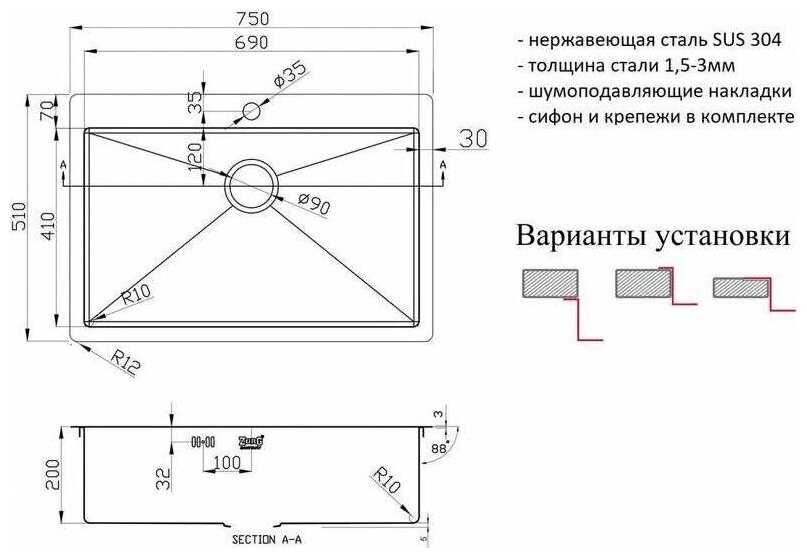 - особенности: отверстие под смеситель