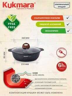 | Дополнительная информация : | антипригарное покрытие Ultra granit усиленное сверхтвердыми минералами нового поколения близкими по твердости алмазу, материал крышки: жаропрочное стекло с бакелитовой ручкой, материал ручек: алюминий |