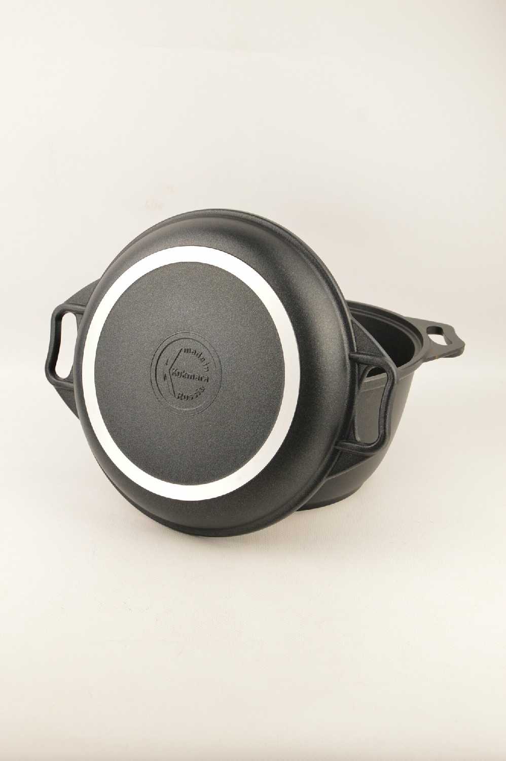 - - Алюминий с покрытием, железной ложкой не пошкрябаешь, только дерево или пластик. Но это не сильный недостаток, зато никакой возни, как с чугуниной