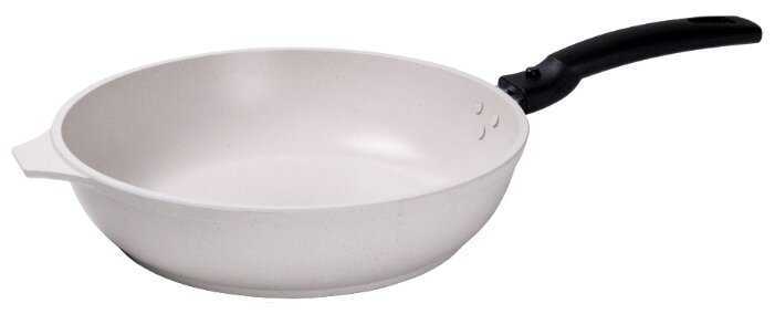 - + Отличная сковорода. В меру тяжелая. Съёмная ручка - удобство при хранении. Высокие бортики, удобно при перемешивании.