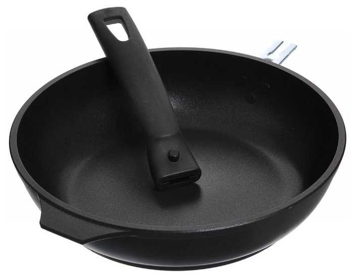 - + Съемная ручка. Крышка в комплекте. Высокий бортик. Всё это позволяет использовать сковороду в т.ч. в духовке, для приготовления например жаркого. Производитель даёт гарантию на мытьё в посудомоечной машине без последствий для покрытия. И конечно цена.