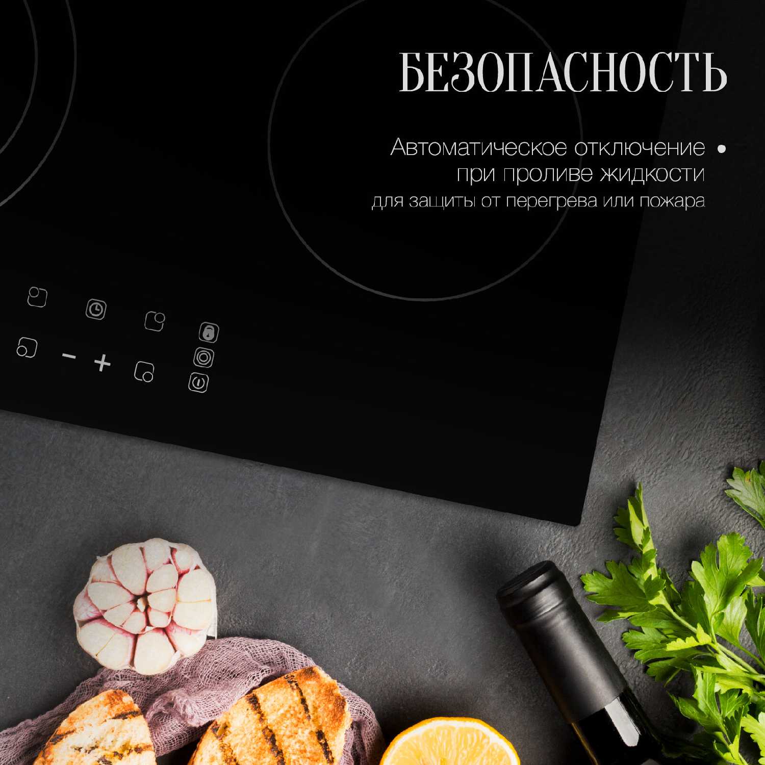 Встроенное аварийное отключение срабатывает при критическом нагреве или проливе жидкости на панель. Функция упоминается в контексте безопасности — например, при оставленной без присмотра посуде. Индикатор остаточного тепла дополняет эту защиту, визуально сигнализируя о горячей поверхности. -