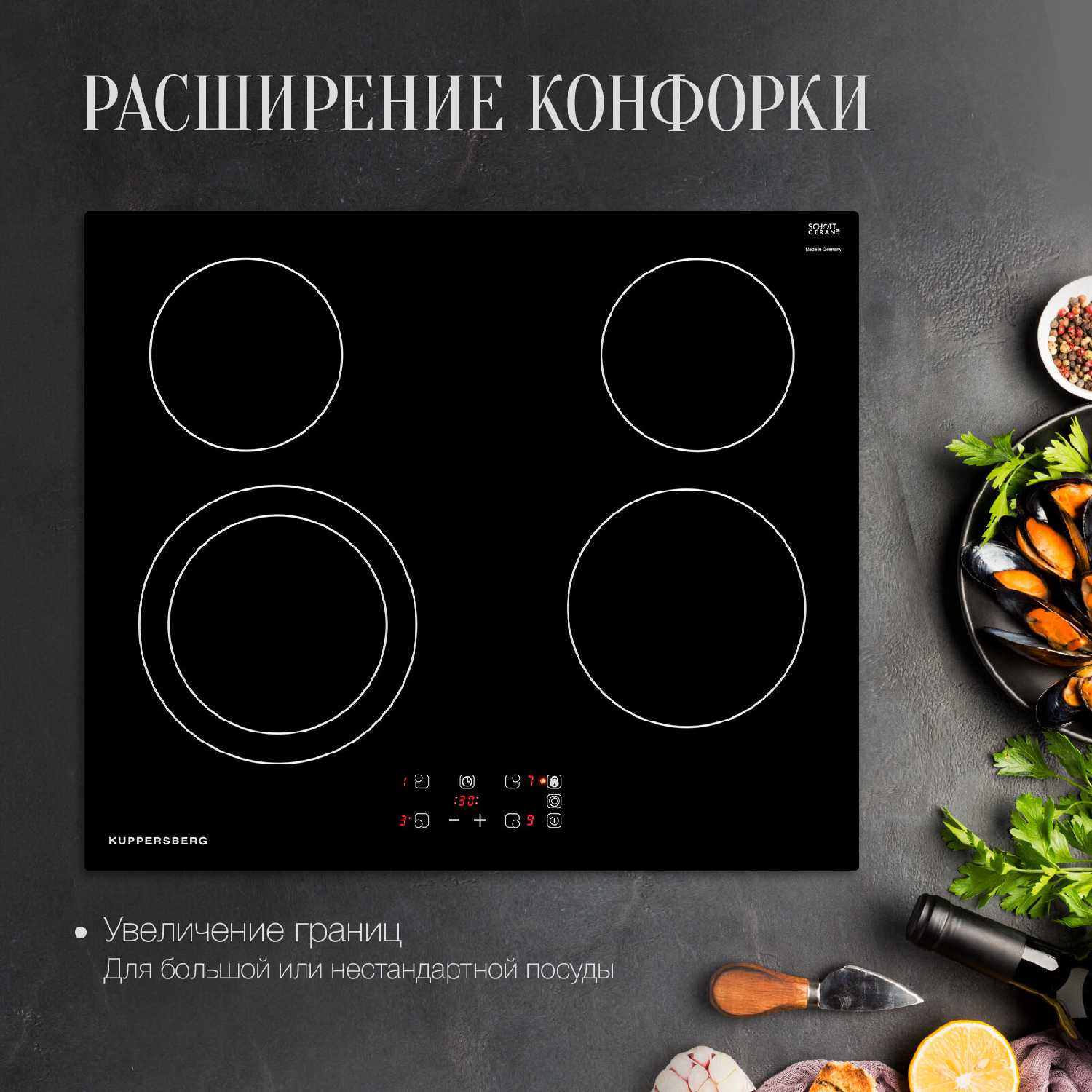 Благодаря идеально ровной поверхности стеклокерамики и равномерному распределению тепла даже посуда с небольшими дефектами дна нагревается без "холодных зон". Особенно эффективно это проявляется на расширяемой конфорке, где тепло адаптируется под диаметр ёмкости. -