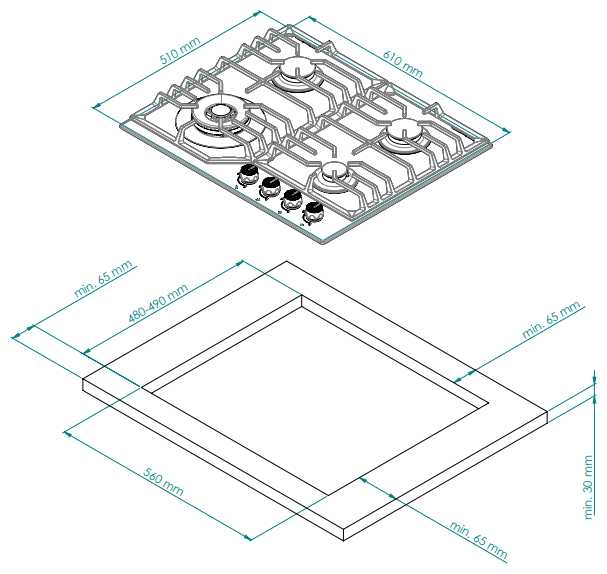 - Расстояние 32 см между центрами конфорок позволяет одновременно использовать 4 кастрюли диаметром 24–26 см.