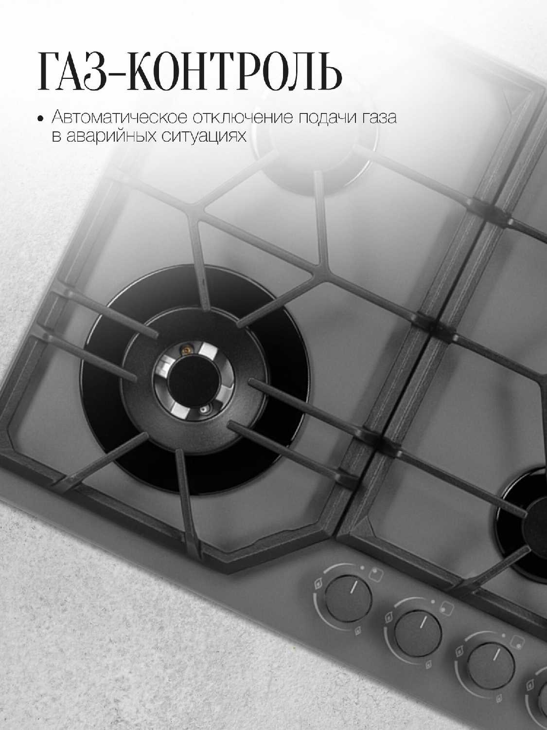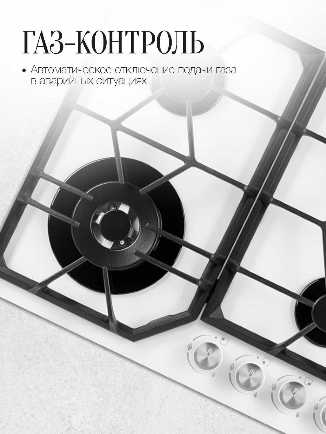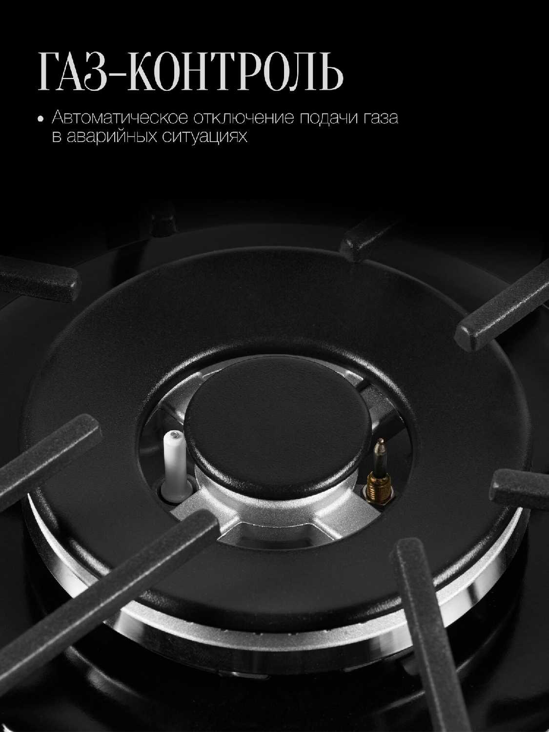 - Функция газ-контроля автоматически отключает подачу газа при затухании пламени от пролива жидкости, обеспечивая дополнительный уровень безопасности.