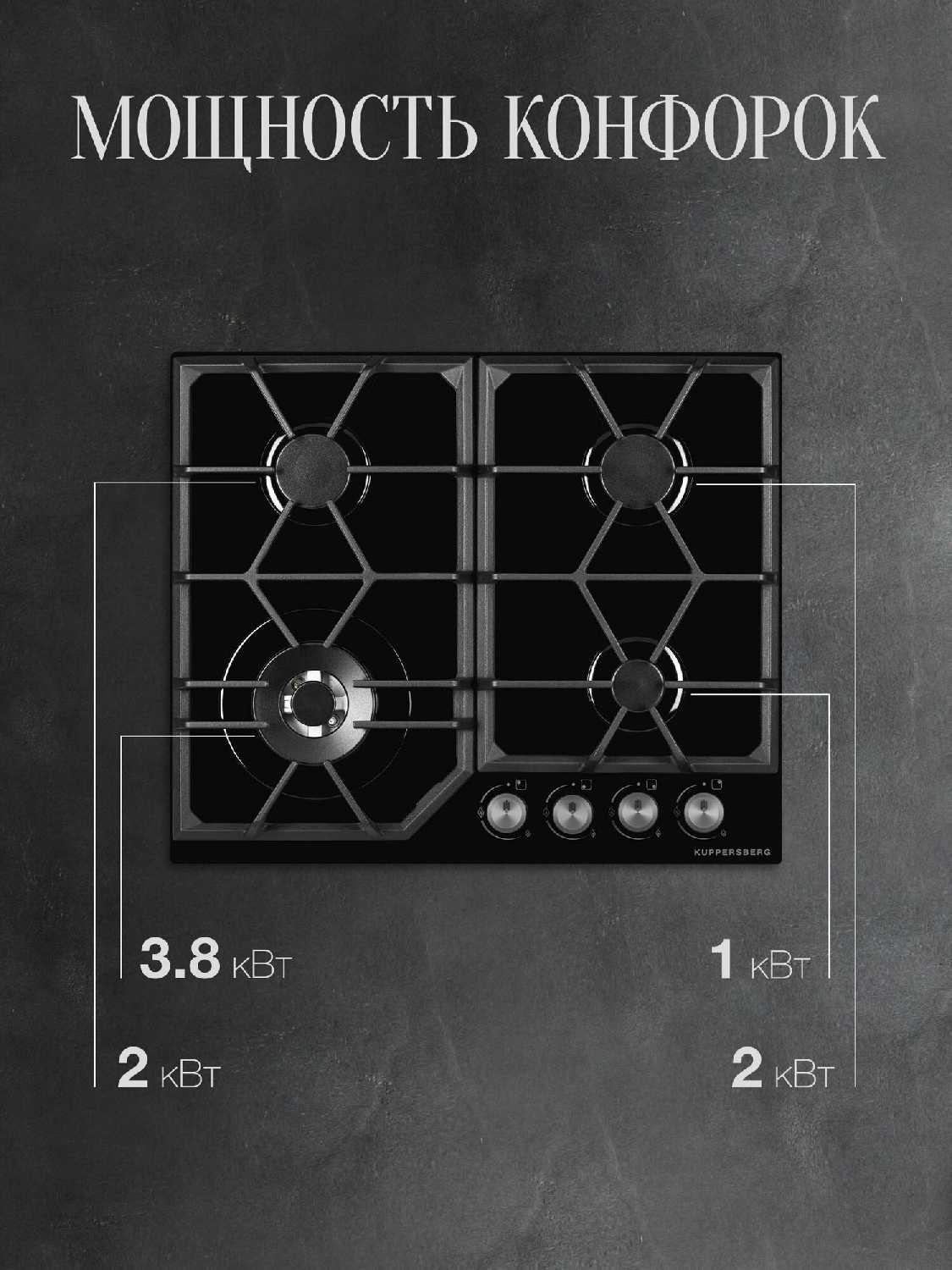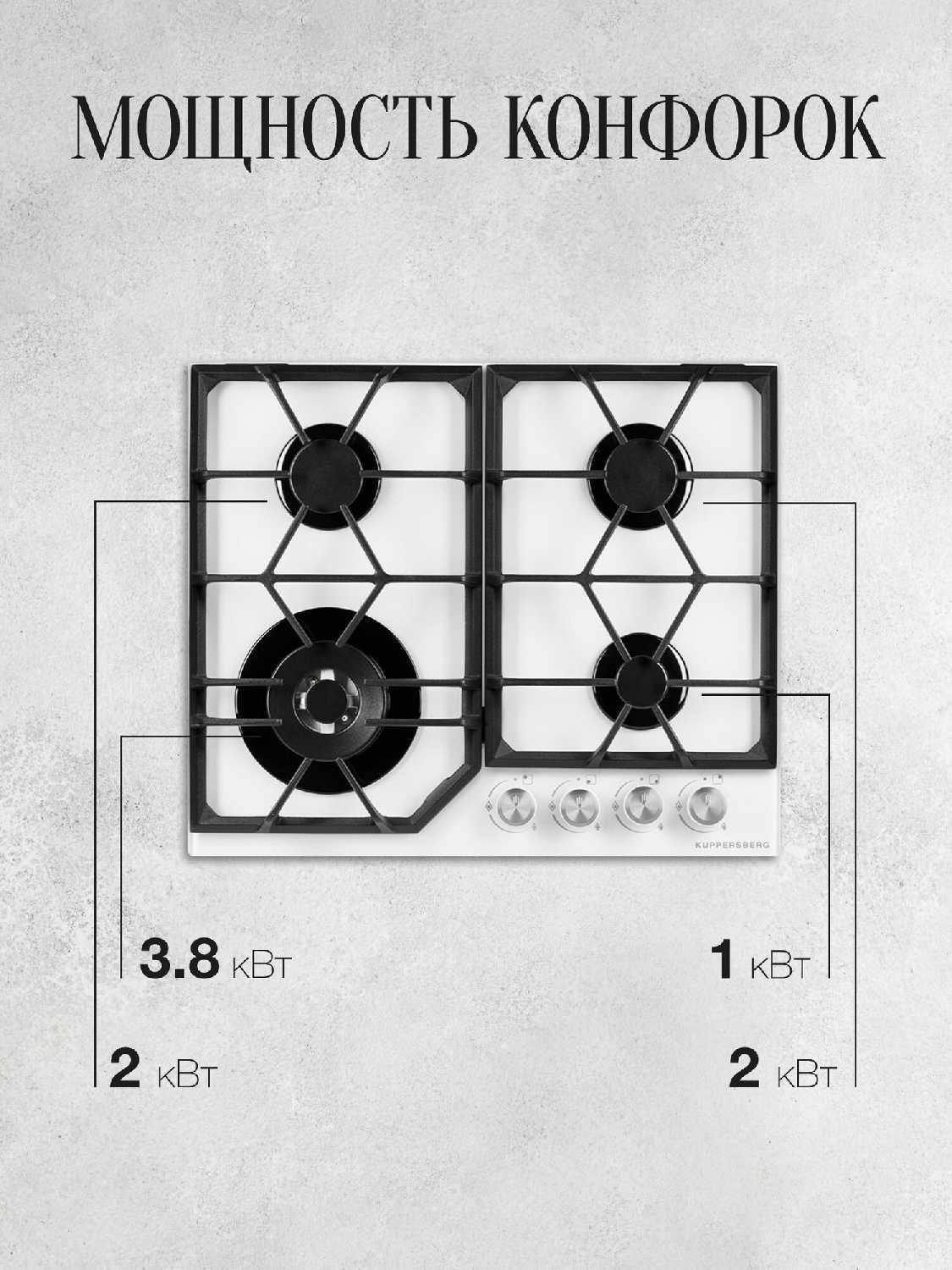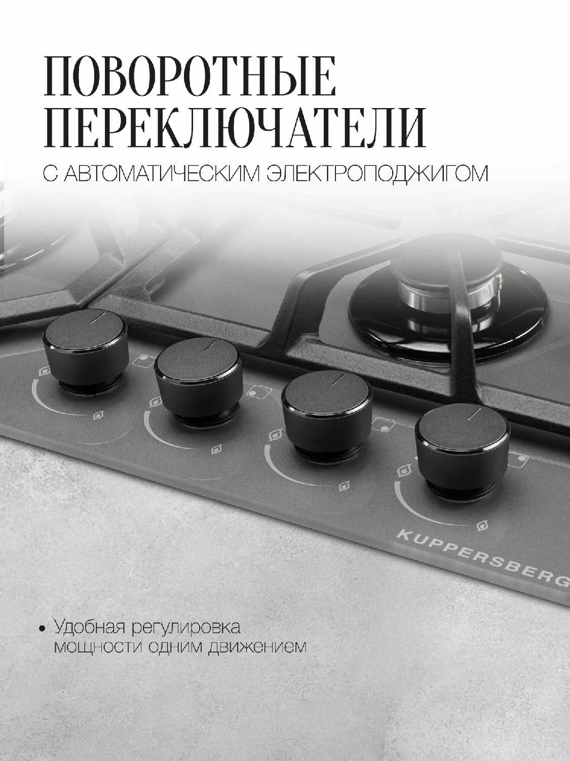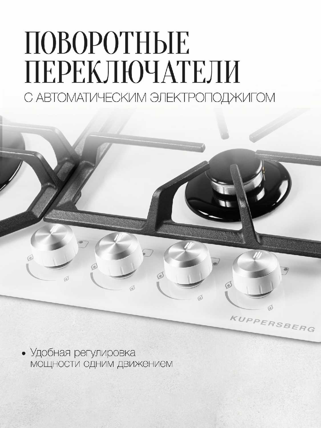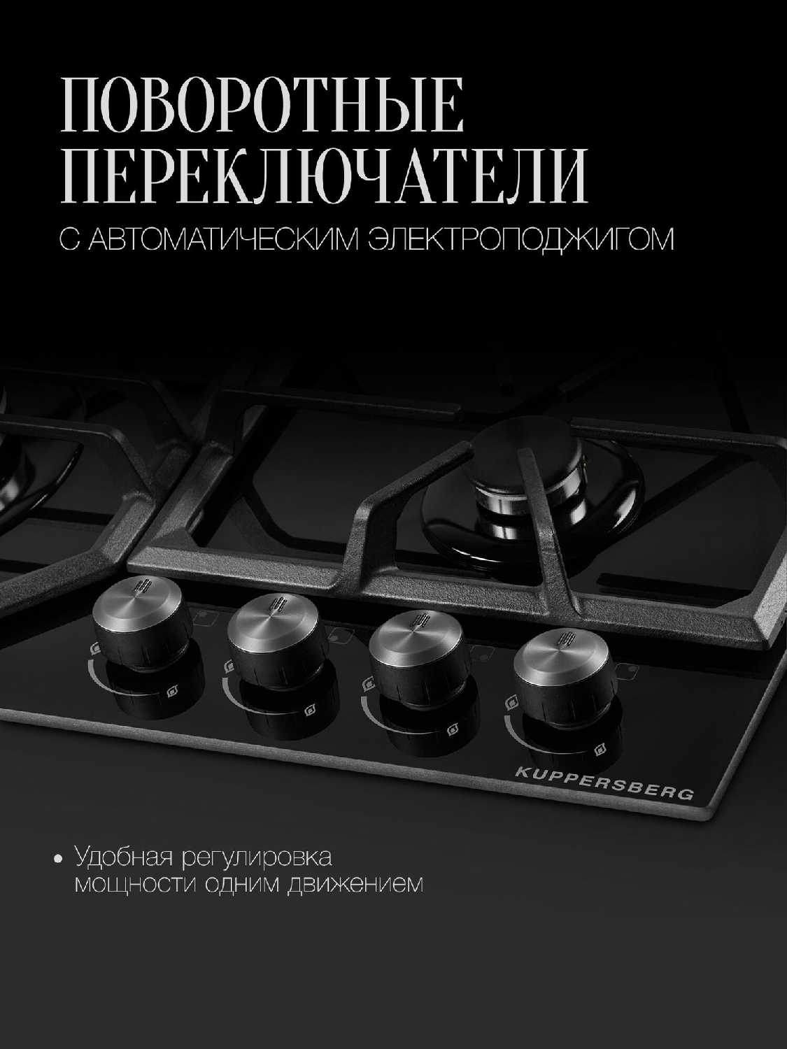 - Электроподжиг срабатывает практически моментально и стабильно работает на всех конфорках, исключая необходимость использования спичек или зажигалок.