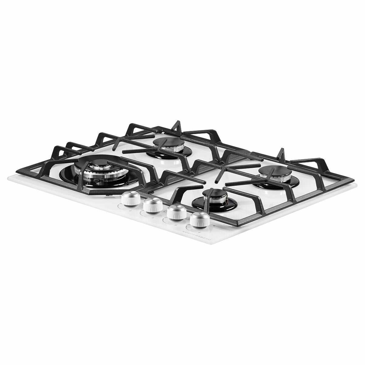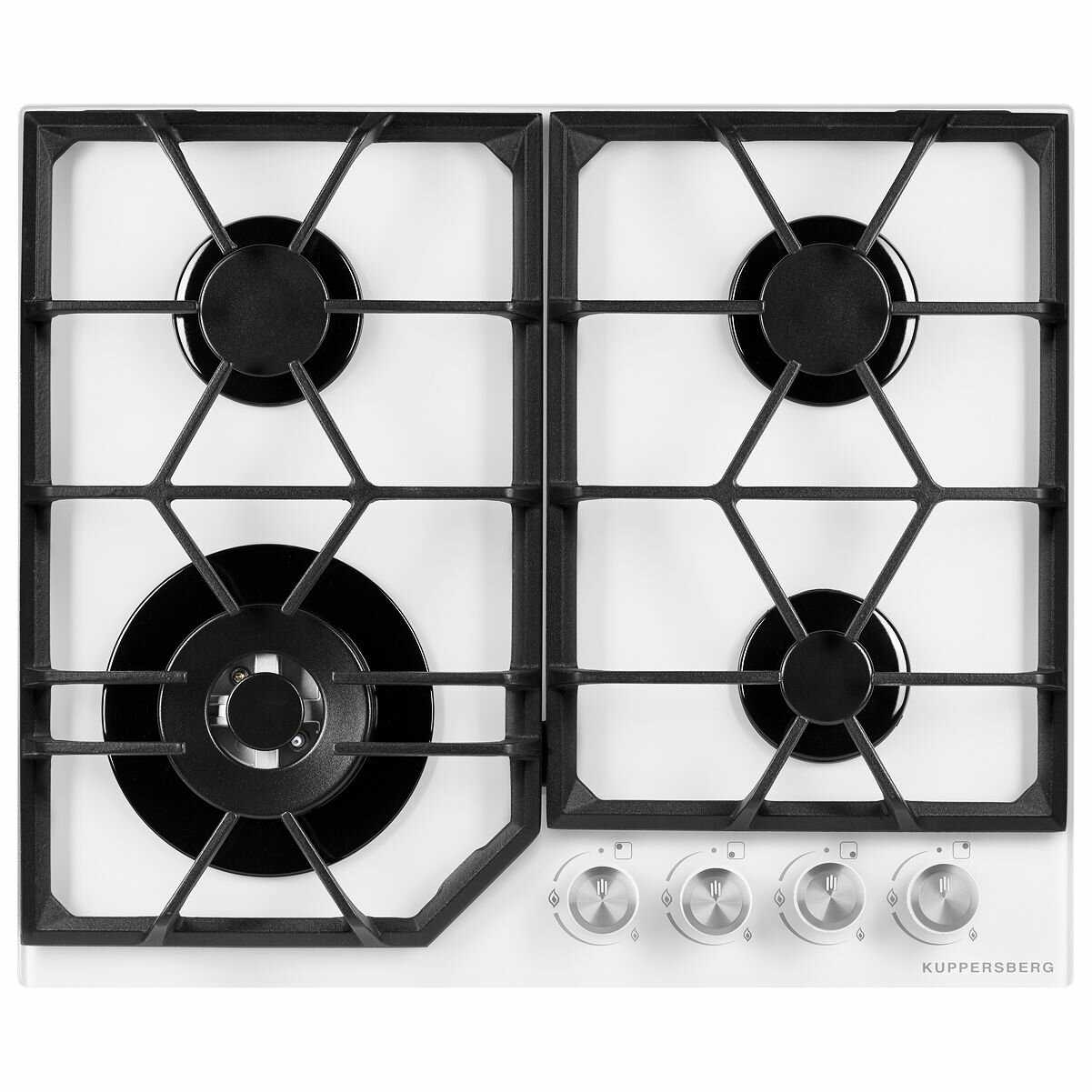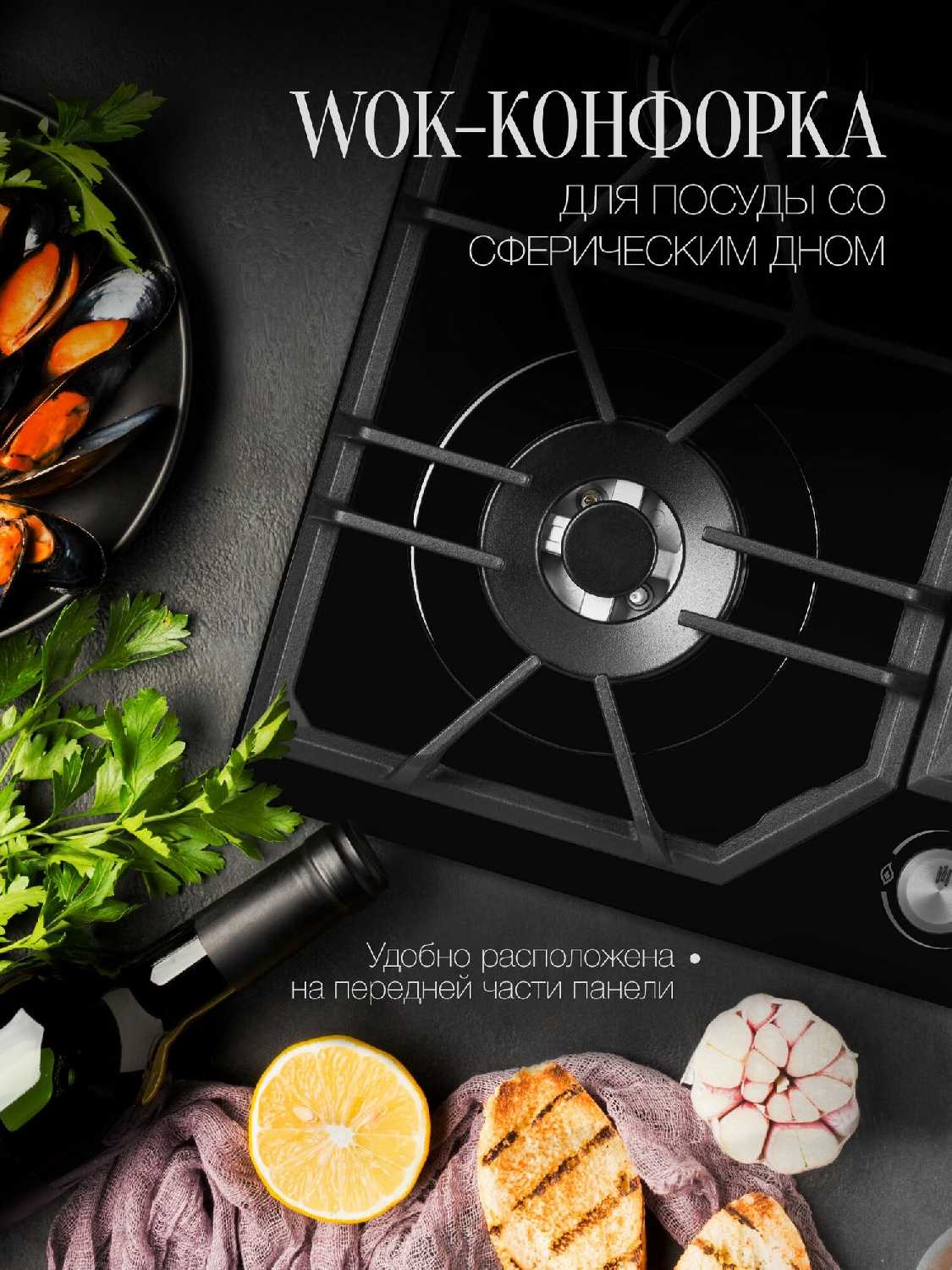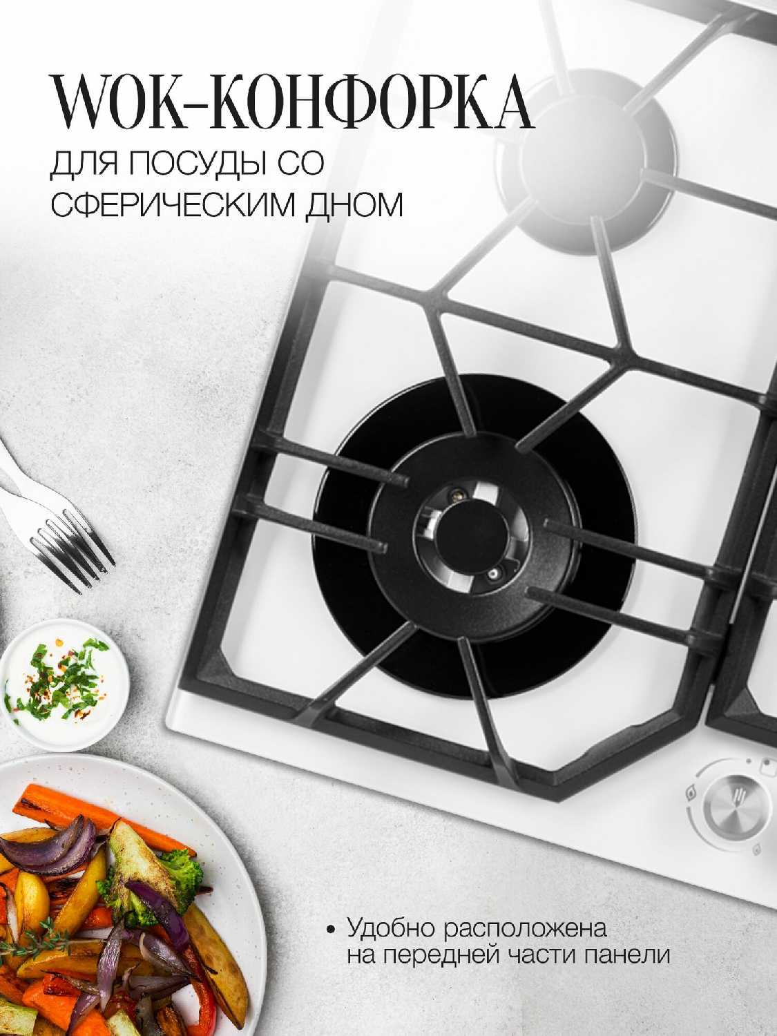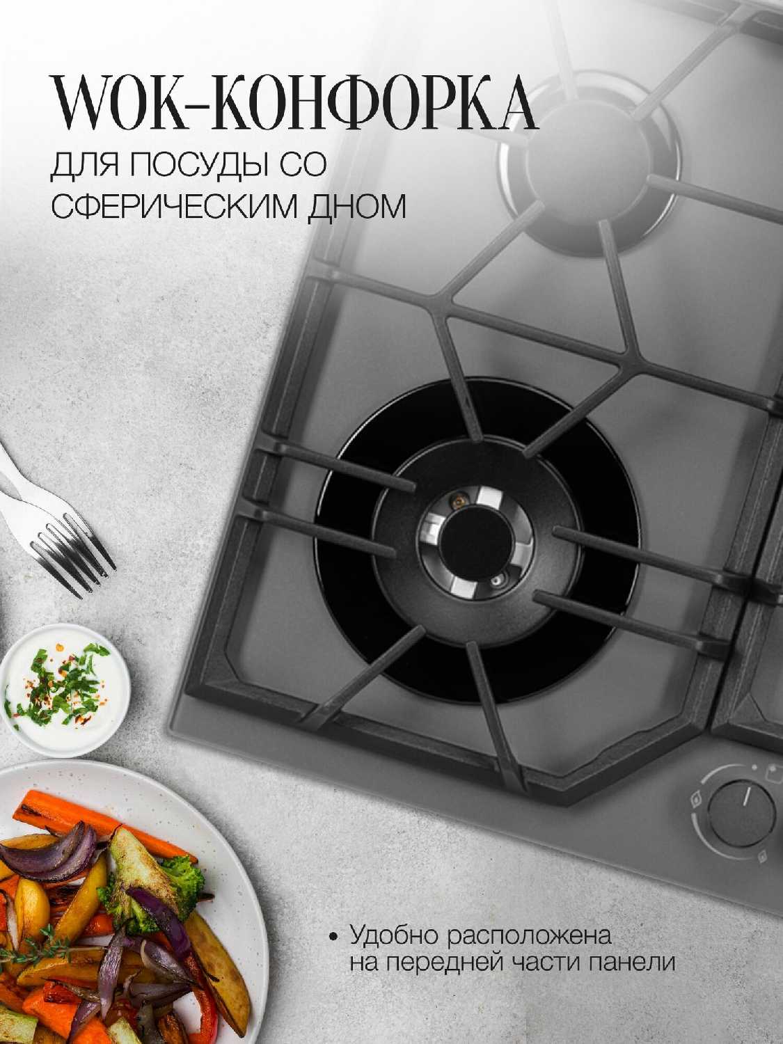 - Четыре конфорки разного диаметра, включая усиленную WOK-конфорку с двойным контуром пламени, обеспечивают быстрое закипание и равномерный нагрев для различных типов посуды.