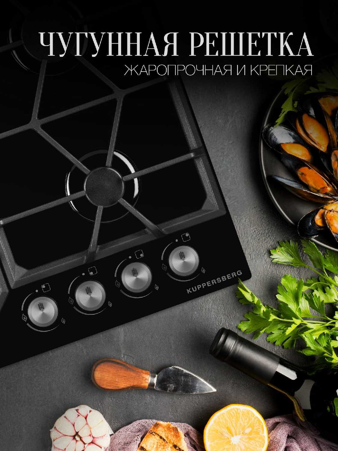 - Центральное расположение ручек управления обеспечивает удобный доступ и визуальный контроль над включенными конфорками, исключая случайные касания столешницы.