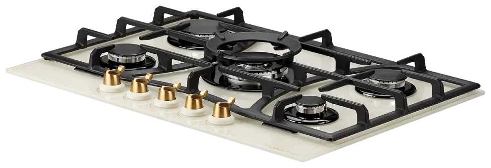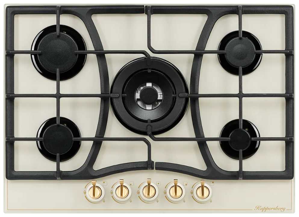 - Пять конфорок с разной мощностью и диаметром для одновременного приготовления:
