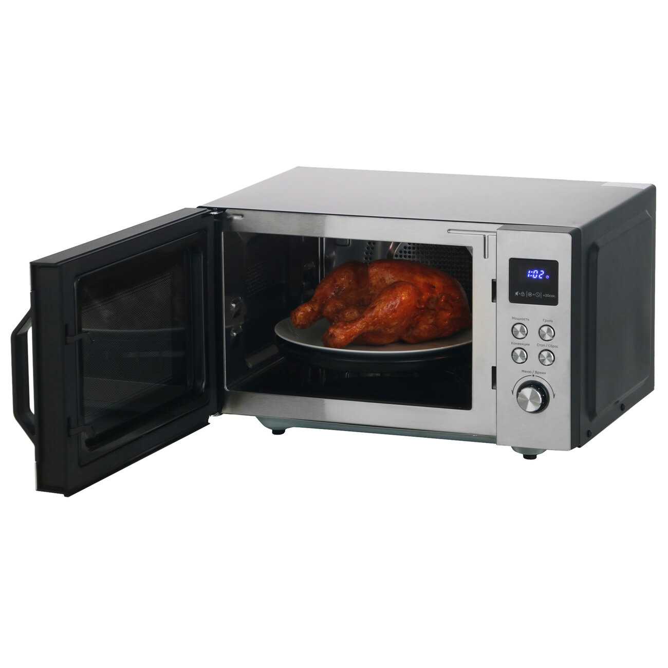 - Комбинация микроволн и гриля сокращает время запекания мяса до 15–20 минут.