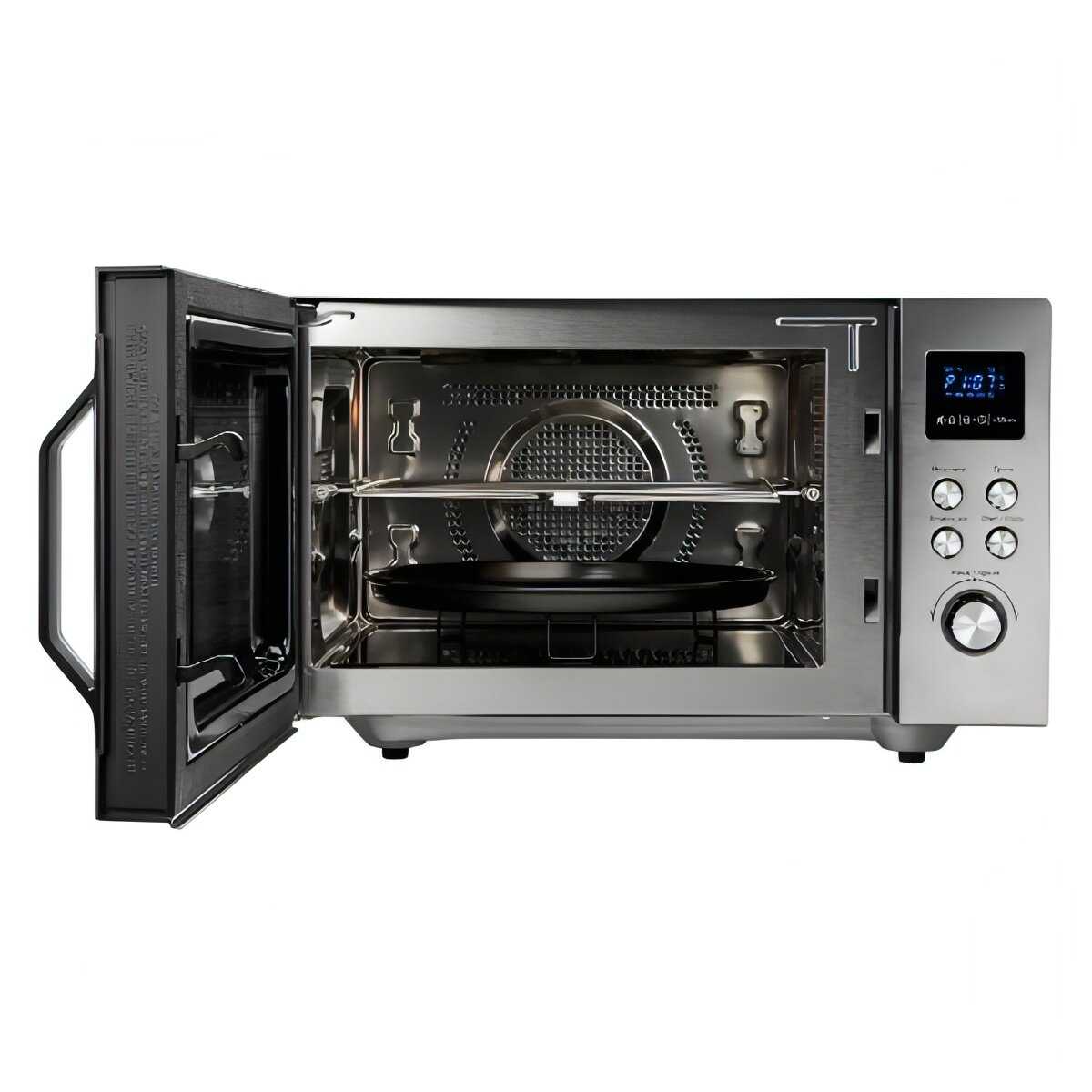 - Режим конвекции с вентилятором заменяет духовку: выпечка (например, пицца или кексы) готовится на 30–40% быстрее.