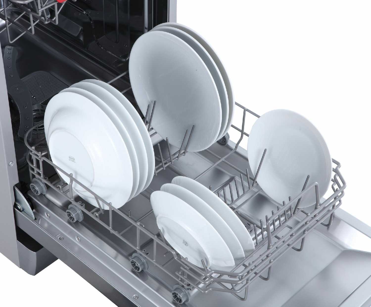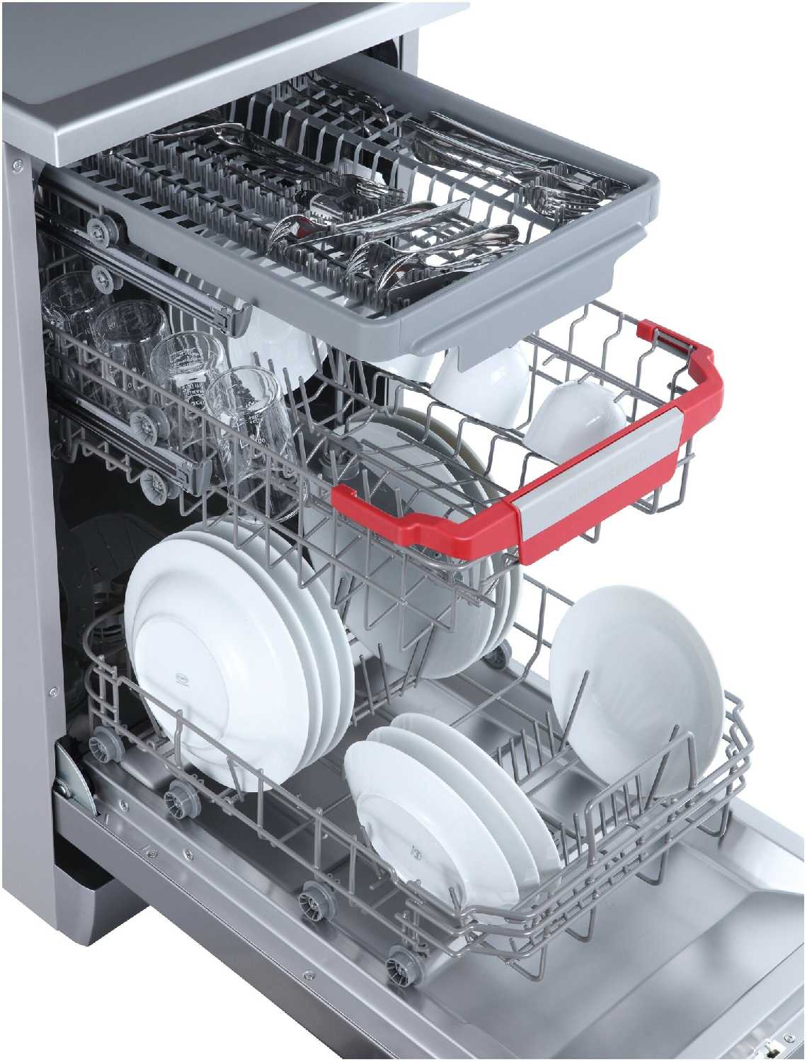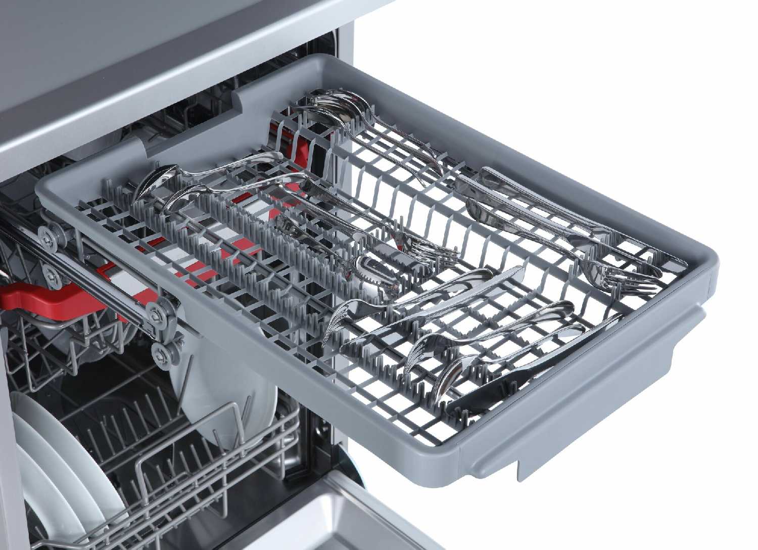 - Отдельный выдвижной лоток для столовых приборов увеличивает вместимость и обеспечивает тщательное мытье мелких предметов.