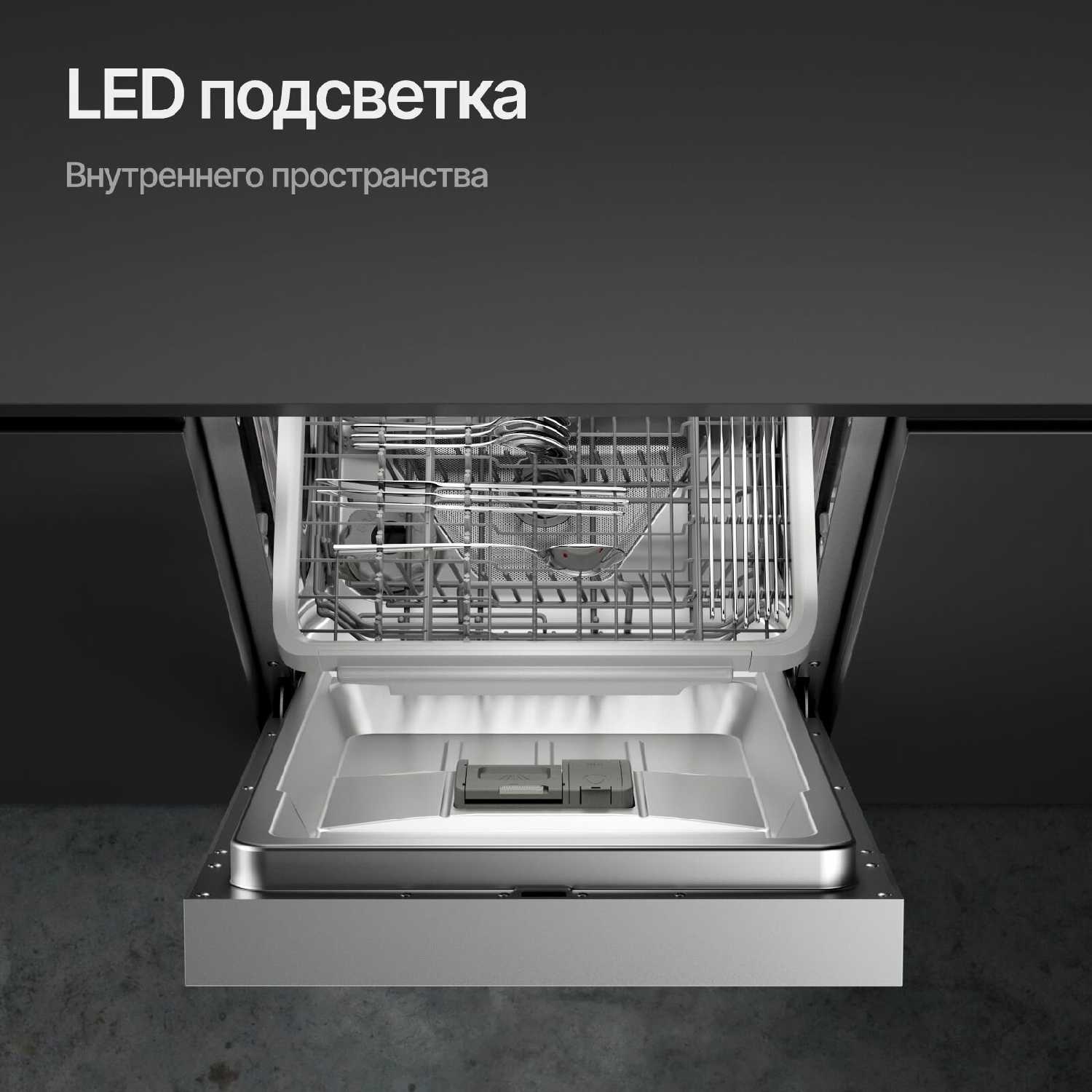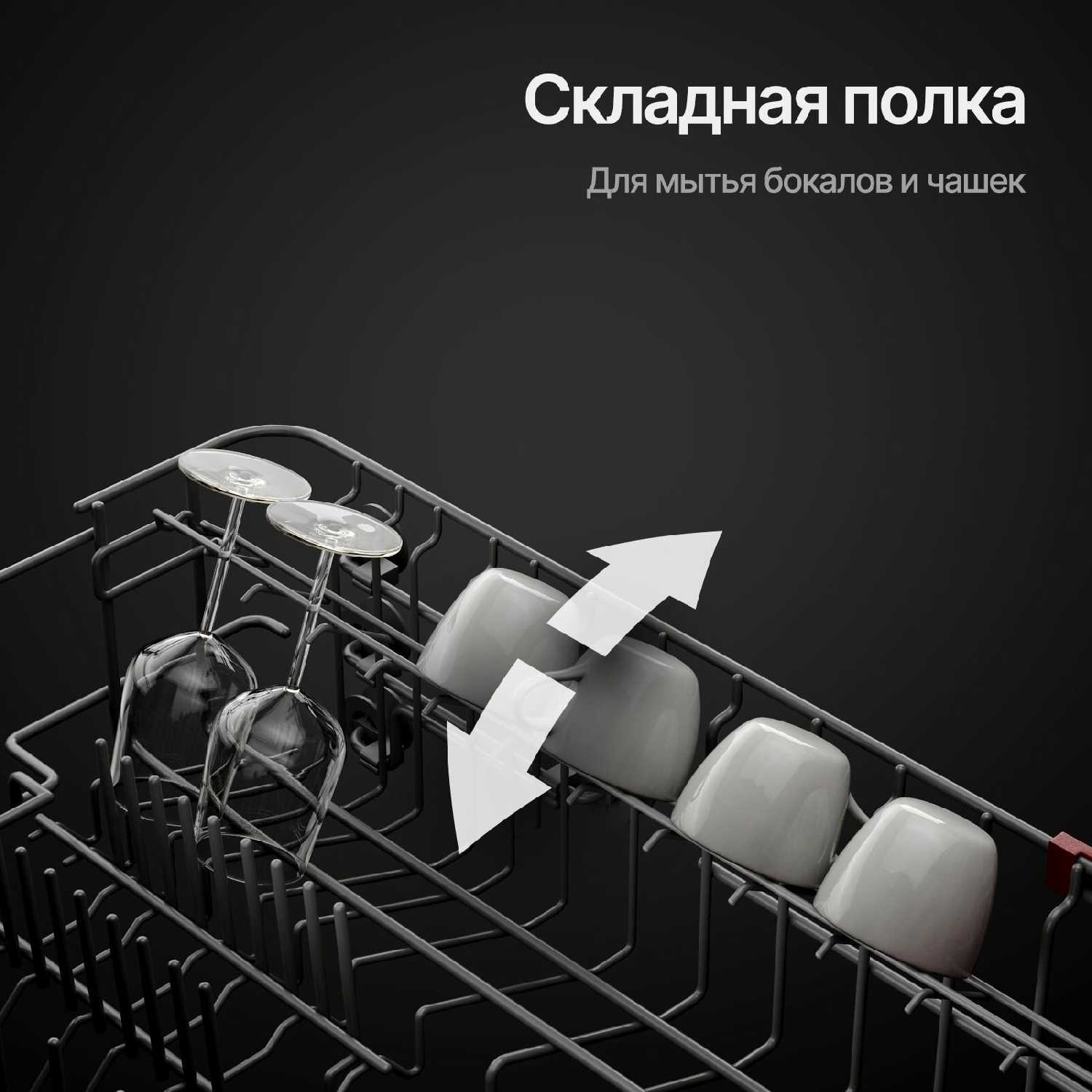 Автопрограмма автоматически определяет длительность и температуру мойки по степени загрязнения. Световой индикатор подсвечивает отсек при открывании. Складные держатели на первом лотке позволяют размещать крупную посуду. Эти особенности снижают необходимость ручной настройки.