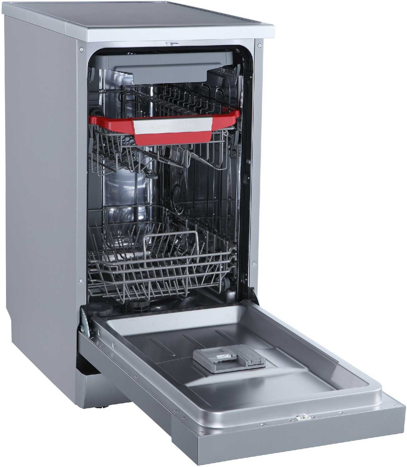 Ключевой отличительной чертой и огромным преимуществом этой модели, многократно отмеченным в отзывах, является наличие трех корзин, включая отдельный выдвижной лоток для столовых приборов (вилок, ложек, ножей), расположенный в верхней части. Это решение признано гораздо более удобным, чем традиционная корзинка, и значительно увеличивает полезный объем загрузки. Верхняя корзина для посуды регулируется по высоте, что позволяет размещать высокие предметы внизу. На нижней корзине задние держатели складные, что также повышает гибкость загрузки. Несмотря на компактные внешние габариты, машина признается очень вместительной, способной за один цикл вымыть посуду, накопленную за день семьей из 3-4 человек, включая кастрюли и сковородки. Удобство раскладки посуды внутри отмечается многими, хотя некоторые пользователи уточняют, что инструкция не всегда понятна и пришлось искать руководства по загрузке в интернете.