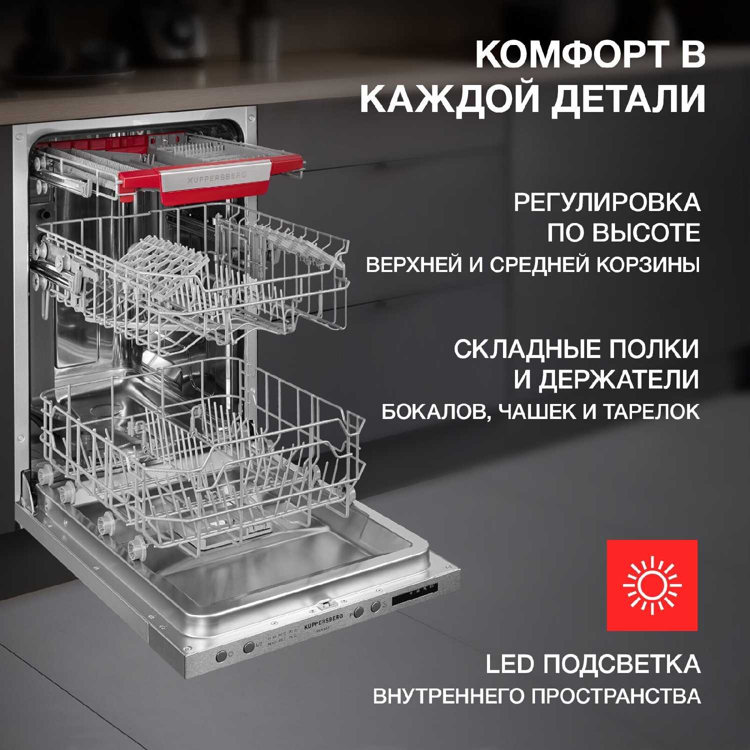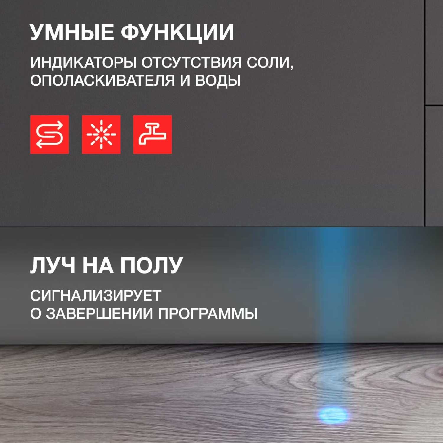 Эргономика, вместительность и конструктивные особенности: Организация внутреннего пространства и регулировка элементов. Конструкция внутренней камеры получила высокие оценки за продуманность и гибкость. Наличие трех уровней загрузки, включая верхний лоток исключительно для столовых приборов, признано ключевым преимуществом, особенно для компактной 45-см модели. Пользователи отмечают, что это решение освобождает значительное пространство в нижней корзине для размещения крупных предметов, таких как кастрюли, сковороды и противни. Важной функцией является возможность регулировки высоты средней корзины, что позволяет адаптировать пространство под высокую посуду. Складные держатели тарелок в нижней корзине также добавляют гибкости при загрузке. Однако некоторые пользователи отметили, что фурнитура корзин (ролики, направляющие) при выдвижении может издавать более громкий звук по сравнению с их предыдущей техникой, а пластиковые элементы в зоне разбрызгивателей иногда мешают устойчивой установке блюдец. В целом, эргономика оценивается как очень эффективная, максимизирующая полезный объем при компактных внешних габаритах. Качество сборки, материалы и долговечность. Большинство отзывов характеризуют сборку как добротную и надежную. Пользователи положительно оценивают полностью металлическую дверцу, металлическое дно камеры (в отличие от пластикового у некоторых аналогов) и общее ощущение прочности. Наличие защиты от протечек является стандартом для категории и упоминается как важный фактор безопасности. Встречаются единичные критические замечания, касающиеся определенных деталей: например, некоторым владельцам показалась хлипковатой фурнитура корзин или кнопки на панели управления. Также отмечен случай с жестким шлангом подачи воды, который создал сложности при плотной установке машины к стене. Опыт пользователей, эксплуатирующих технику этого бренда долгие годы (7-10 лет), позволяет говорить о потенциально высокой надежности модели, однако для окончательных выводов о долговечности данной конкретной модели требуется больше времени. Удобство эксплуатации и система индикации. Система управления и информирования пользователя получила в основном положительные отзывы. Сенсорная панель с интуитивно понятными значками позволяет быстро освоить управление. Ключевой особенностью, отмеченной практически всеми пользователями, является световой проекционный луч на полу. Данная функция выполняет роль визуального индикатора работы: пока машина моет, луч горит, а по окончании цикла гаснет или начинает мигать, что особенно удобно при бесшумной работе аппарата. Дополнительно о завершении цикла оповещает звуковой сигнал. Внутренняя подсветка камеры, автоматически отключающаяся через некоторое время после открытия дверцы, упрощает процесс разгрузки. Функция отсрочки старта позволяет запрограммировать мойку на удобное время, например, на ночь, чтобы воспользоваться ночным тарифом на электроэнергию. Эти элементы в совокупности значительно повышают удобство ежедневного использования.