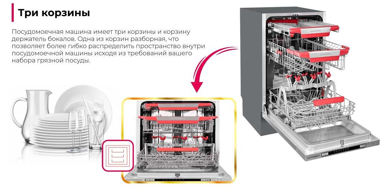 - Трёхуровневая система загрузки с регулируемыми корзинами: