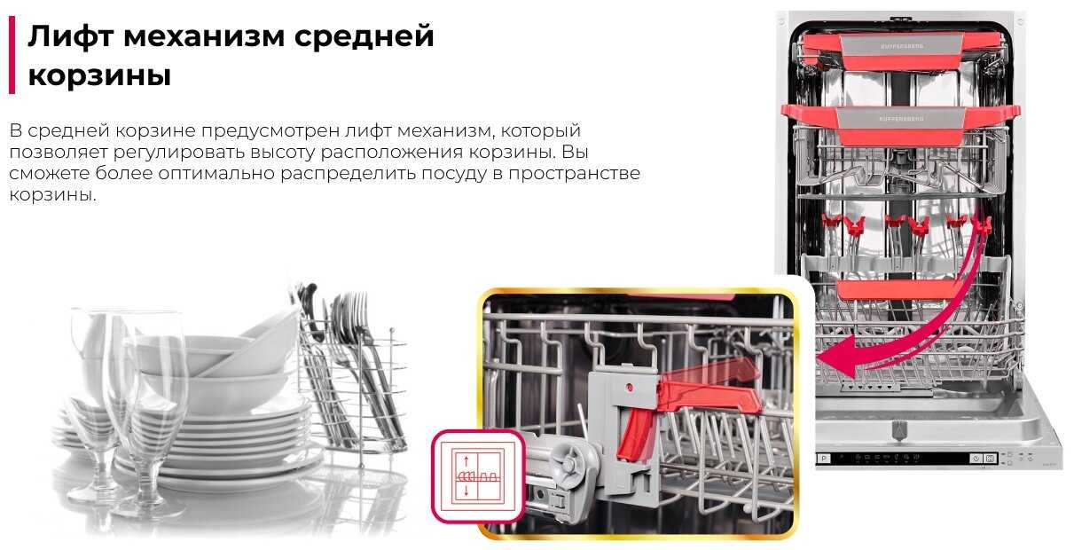 - Отдельный лоток для бокалов предотвращает их повреждение и обеспечивает равномерное омывание.