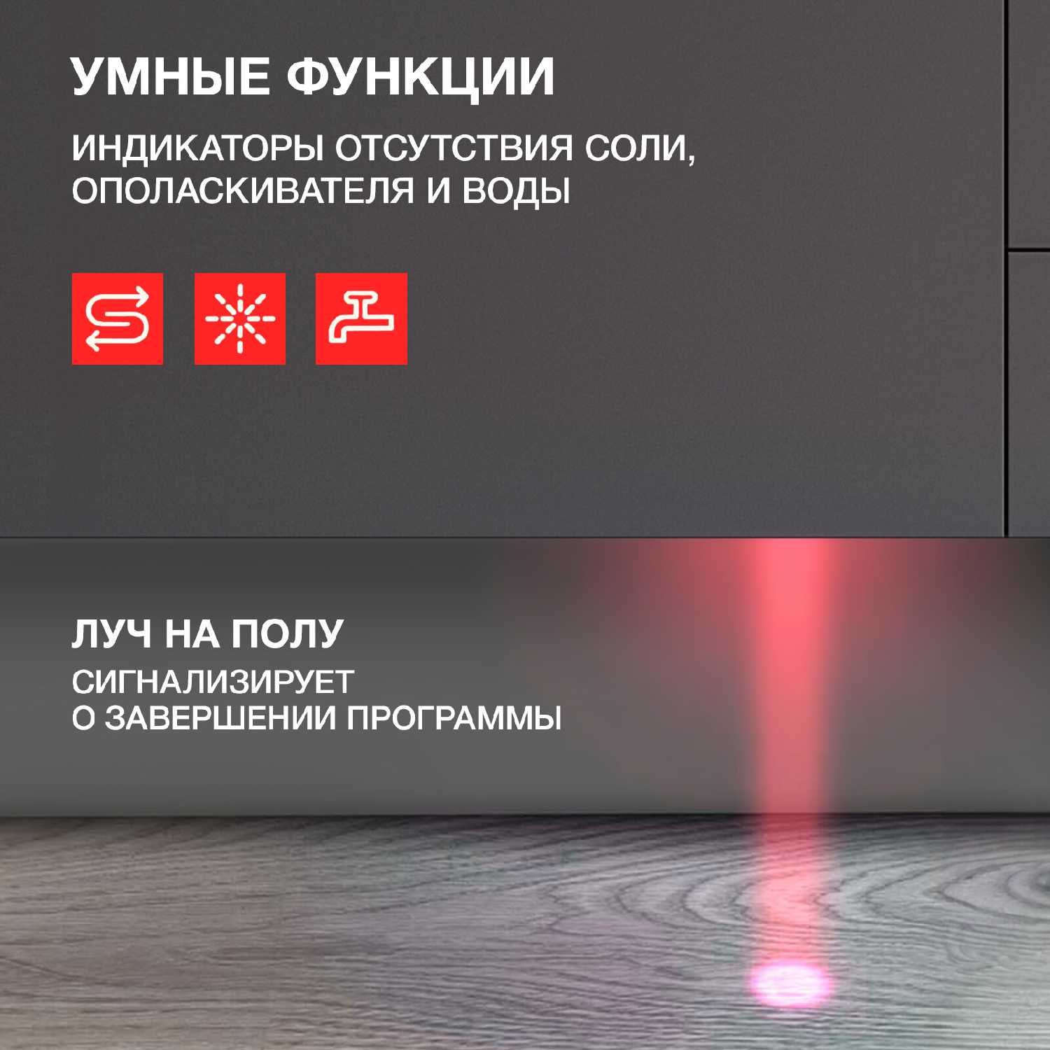 Функция луч на полу понравилась, так как машина тихая и всегда понятно что она ещё моет посуду , в старой машине таких примочек не было, действительно эти мелочи оказались важными при использовании. Нам очень понравилась модель, жена в восторге .