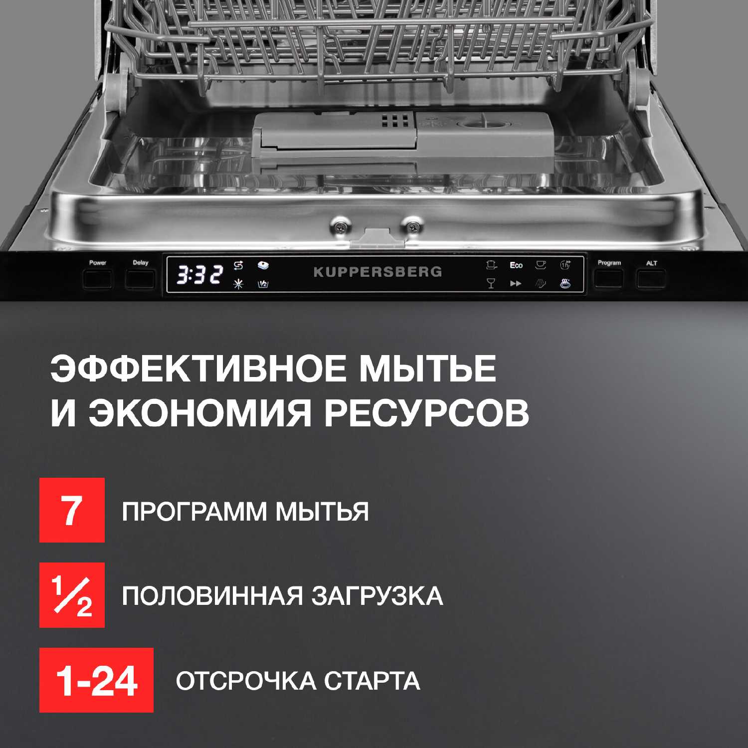 - + Есть половинная загрузка. Дополнительная сушка. Мытье посуды за 1 час. Ополаскивание посуды.
