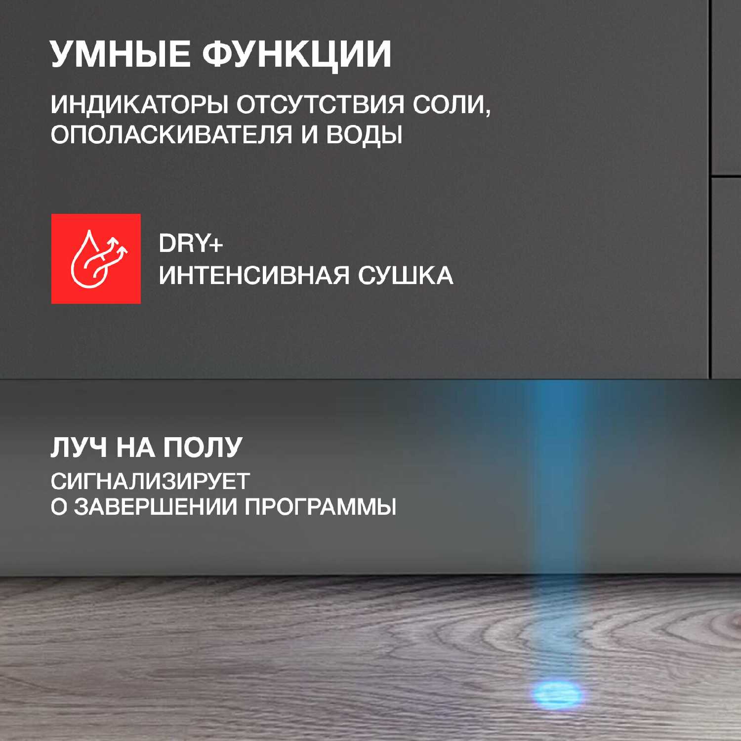 - + Полноразмерная посудомоечная машина, подсветка внутри, луч на пол во время работы.
